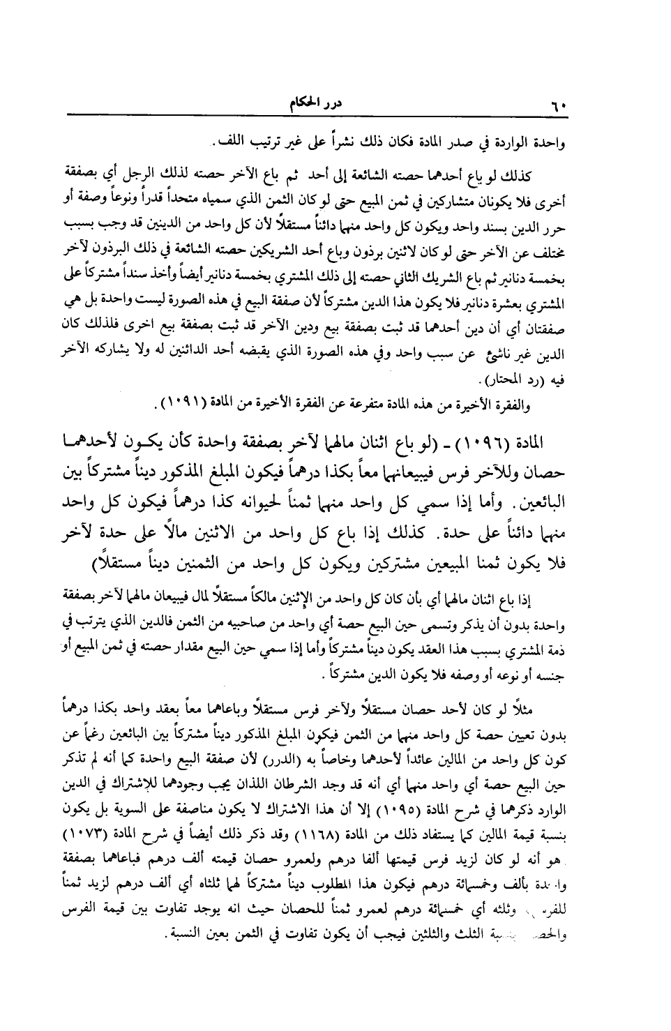 كَذَلِكَ لَوْ بَاعَ أَحَدُهُمَا حِصَّتَهُ الشَّائِعَةَ إلَى أَحَدٍ ثُمَّ بَاعَ الْآخَرُ حِصَّتَهُ لِذَلِكَ الرَّجُلِ أَيْ بِصَفْقَةٍ أُخْرَى فَلَا يَكُونَانِ مُتَشَارِكَيْنِ فِي ثَمَنِ الْمَبِيعِ حَتَّى لَوْ كَانَ الثَّمَنُ الَّذِي سَمَّيَاهُ مُتَّحِدًا قَدْرًا وَنَوْعًا وَصِفَةً أَوْ حُرِّرَ الدَّيْنُ بِسَنَدٍ وَاحِدٍ وَيَكُونُ كُلُّ وَاحِدٍ مِنْهُمَا دَائِنًا مُسْتَقِلًّا لِأَنَّ كُلَّ وَاحِدٍ مِنْ الدَّيِّنَيْنِ قَدْ وَجَبَ بِسَبَبٍ مُخْتَلِفٍ عَنْ الْآخَرِ حَتَّى لَوْ كَانَ لِاثْنَيْنِ بِرْذَوْنٌ وَبَاعَ أَحَدُ الشَّرِيكَيْنِ حِصَّتَهُ الشَّائِعَةَ فِي ذَلِكَ الْبِرْذَوْنِ لِآخَرَ بِخَمْسَةِ دَنَانِيرَ ثُمَّ بَاعَ الشَّرِيكُ الثَّانِي حِصَّتَهُ إلَى ذَلِكَ الْمُشْتَرِي بِخَمْسَةِ دَنَانِيرَ أَيْضًا وَأَخَذَ سَنَدًا مُشْتَرَكًا عَلَى الْمُشْتَرِي بِعَشَرَةِ دَنَانِيرَ فَلَا يَكُونُ هَذَا الدَّيْنُ مُشْتَرَكًا لِأَنَّ صَفْقَةَ الْبَيْعِ فِي هَذِهِ الصُّورَةِ لَيْسَتْ وَاحِدَةً بَلْ هِيَ صَفْقَتَانِ أَيْ أَنَّ دَيْنَ أَحَدِهِمَا قَدْ ثَبَتَ بِصَفْقَةِ بَيْعٍ وَدَيْنَ الْآخَرِ قَدْ ثَبَتَ بِصَفْقَةِ بَيْعٍ أُخْرَى فَلِذَلِكَ كَانَ الدَّيْنُ غَيْرَ نَاشِئٍ عَنْ سَبَبٍ وَاحِدٍ وَفِي هَذِهِ الصُّورَةِ الَّذِي يَقْبِضُهُ أَحَدُ الدَّائِنَيْنِ لَهُ وَلَا يُشَارِكُهُ الْآخَرُ فِيهِ (رَدُّ الْمُحْتَارِ) وَالْفِقْرَةُ الْأَخِيرَةُ مِنْ هَذِهِ الْمَادَّةِ مُتَفَرِّعَةٌ عَنْ الْفِقْرَةِ الْأَخِيرَةِ مِنْ الْمَادَّةِ (1 9 0 1) . .