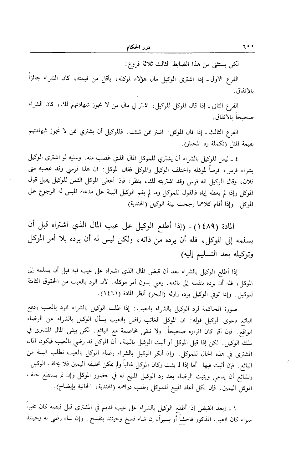 الْمَادَّةُ (1489) - (إذَا اطَّلَعَ الْوَكِيلُ عَلَى عَيْبِ الْمَالِ الَّذِي اشْتَرَاهُ قَبْلَ أَنْ يُسَلِّمَهُ إلَى الْمُوَكِّلِ، فَلَهُ أَنْ يَرُدَّهُ مِنْ ذَاتِهِ، وَلَكِنْ لَيْسَ لَهُ أَنْ يَرُدَّهُ بِلَا أَمْرِ الْمُوَكِّلِ وَتَوْكِيلُهُ بَعْدَ التَّسْلِيمِ إلَيْهِ) إذَا اطَّلَعَ الْوَكِيلُ بِالشِّرَاءِ بَعْدَ أَنْ قَبَضَ الْمَالَ الَّذِي اشْتَرَاهُ عَلَى عَيْبٍ فِيهِ قَبْلَ أَنْ يُسَلِّمَهُ إلَى الْمُوَكِّلِ، فَلَهُ أَنْ يَرُدَّهُ بِنَفْسِهِ إلَى بَائِعِهِ. يَعْنِي بِدُونِ أَمْرِ مُوَكِّلِهِ؛ لِأَنَّ الرَّدَّ بِالْعَيْبِ مِنْ الْحُقُوقِ الثَّابِتَةِ لِلْوَكِيلِ. وَإِذَا تُوُفِّيَ الْوَكِيلُ يَرُدُّهُ وَارِثُهُ (الْبَحْرُ) اُنْظُرْ الْمَادَّةَ (1461) .