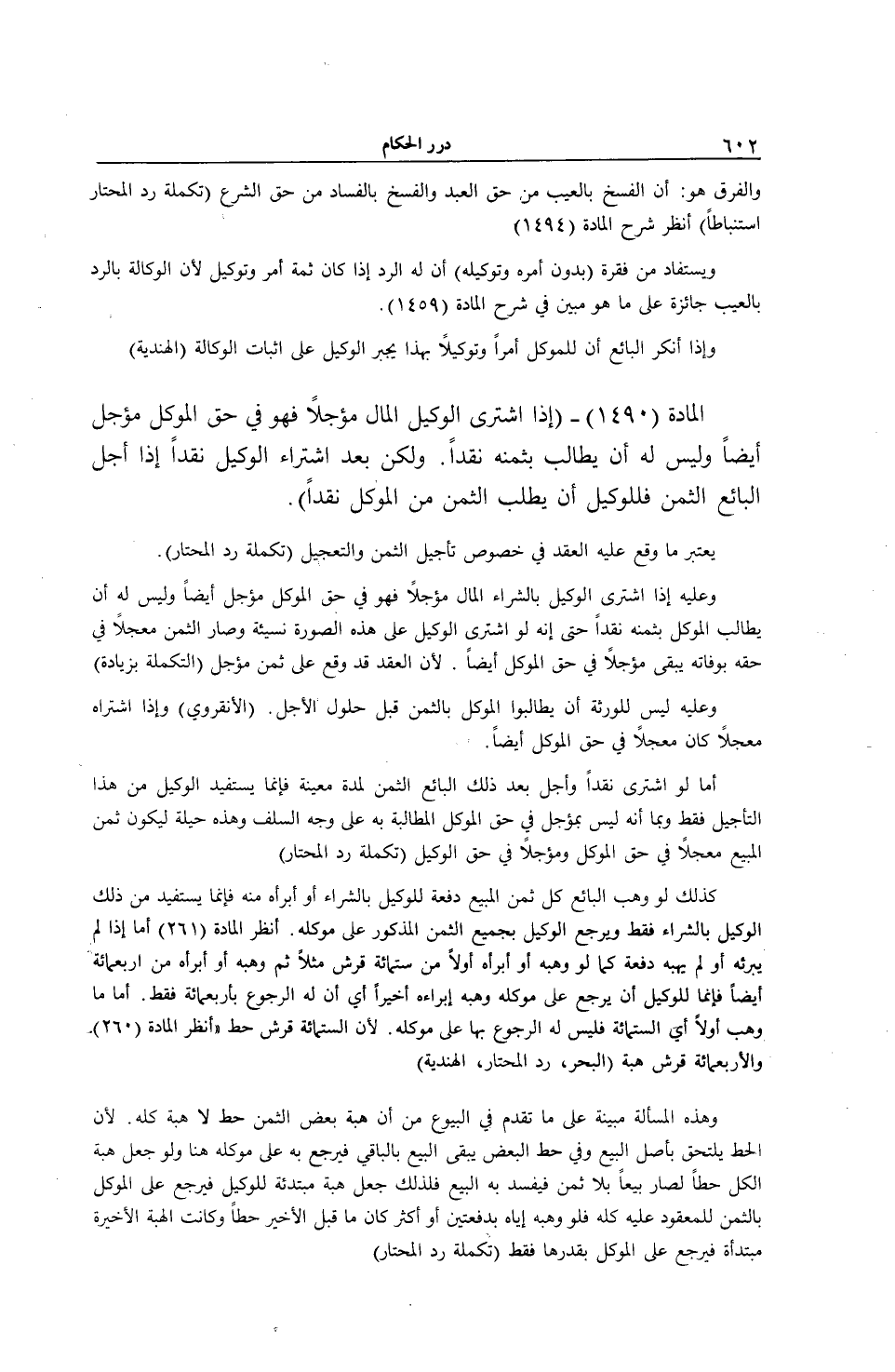 وَإِذَا اشْتَرَاهُ مُعَجَّلًا كَانَ مُعَجَّلًا فِي حَقِّ الْمُوَكِّلِ أَيْضًا. أَمَّا لَوْ اشْتَرَى نَقْدًا وَأَجَّلَ بَعْدَ ذَلِكَ الْبَائِعُ الثَّمَنَ لِمُدَّةٍ مُعَيَّنَةٍ فَإِنَّمَا يَسْتَفِيدُ الْوَكِيلُ مِنْ هَذَا التَّأْجِيلِ فَقَطْ وَبِمَا أَنَّهُ لَيْسَ بِمُؤَجَّلٍ فِي حَقِّ الْمُوَكِّلِ الْمُطَالَبَةُ بِهِ عَلَى وَجْهِ السَّلَفِ وَهَذِهِ حِيلَةٌ لِيَكُونَ ثَمَنُ الْمَبِيعِ مُعَجَّلًا فِي حَقِّ الْمُوَكِّلِ وَمُؤَجَّلًا فِي حَقِّ الْوَكِيلِ (تَكْمِلَةُ رَدِّ الْمُحْتَارِ) كَذَلِكَ لَوْ وَهْبَ الْبَائِعُ كُلَّ ثَمَنِ الْمَبِيعِ دُفْعَةً لِلْوَكِيلِ بِالشِّرَاءِ أَوْ أَبْرَأهُ مِنْهُ فَإِنَّمَا يَسْتَفِيدُ مِنْ ذَلِكَ الْوَكِيلُ بِالشِّرَاءِ فَقَطْ وَيَرْجِعُ الْوَكِيلُ بِجَمِيعِ الثَّمَنِ الْمَذْكُورِ عَلَى مُوَكِّلِهِ. اُنْظُرْ الْمَادَّةَ (261) أَمَّا إذَا لَمْ يُبَرِّئْهُ أَوْ لَمْ يَهَبْهُ دُفْعَةً كَمَا لَوْ وَهَبَهُ أَوْ أَبْرَأهُ أَوَّلًا مِنْ سِتِّمِائَةِ قِرْشٍ مَثَلًا ثُمَّ وَهَبَهُ أَوْ أَبْرَأهُ مِنْ أَرْبَعِمِائَةٍ أَيْضًا فَإِنَّمَا لِلْوَكِيلِ أَنْ يَرْجِعَ عَلَى مُوَكِّلِهِ وَهَبَهُ إبْرَاءَهُ أَخِيرًا، أَيْ أَنَّ لَهُ الرُّجُوعَ بِأَرْبَعِمِائَةٍ فَقَطْ.