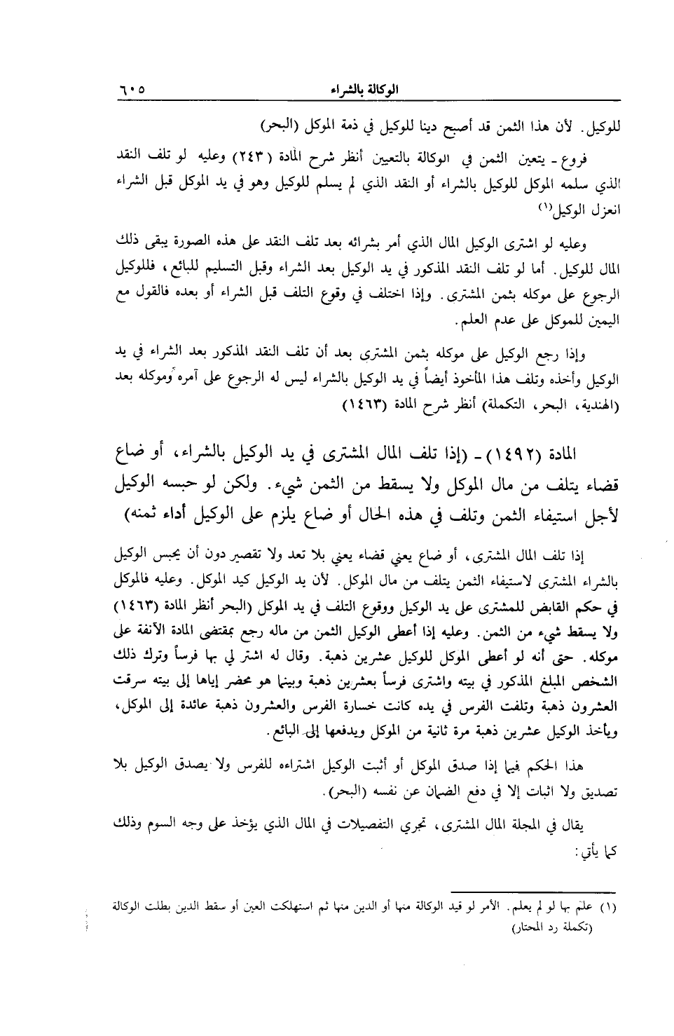 [ (الْمَادَّةُ 1492) إذَا تَلِفَ الْمَالُ الْمُشْتَرَى فِي يَدِ الْوَكِيلِ بِالشِّرَاءِ أَوْ ضَاعَ قَضَاءً]