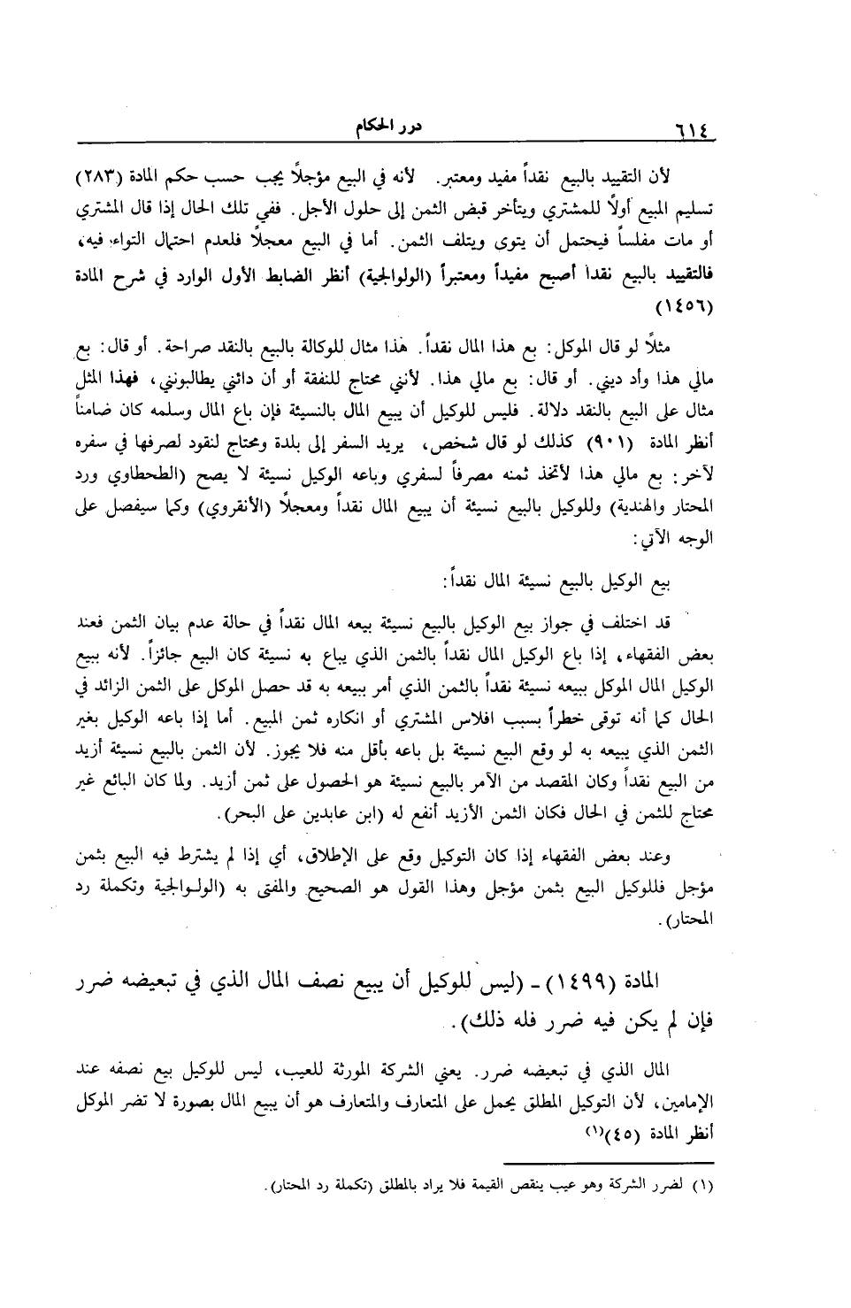 لِأَنَّ التَّقْيِيدَ بِالْبَيْعِ نَقْدًا مُفِيدٌ وَمُعْتَبَرٌ؛ لِأَنَّهُ فِي الْبَيْعِ مُؤَجَّلًا يَجِبُ حَسَبَ حُكْمِ الْمَادَّةِ (283) تَسْلِيمُ الْمَبِيعِ أَوَّلًا لِلْمُشْتَرِي وَيَتَأَخَّرُ قَبْضُ الثَّمَنِ إلَى حُلُولِ الْأَجَلِ. فَفِي تِلْكَ الْحَالِ إذَا قَالَ: الْمُشْتَرِي أَوْ مَاتَ مُفْلِسًا فَيُحْتَمَلُ أَنْ يَتْوَى وَيَتْلَفَ الثَّمَنُ أَمَّا فِي الْبَيْعِ مُعَجَّلًا فَلِعَدَمِ احْتِمَالِ الْتِوَاءِ فِيهِ، فَالتَّقْيِيدُ بِالْبَيْعِ نَقْدًا أَصْبَحَ مُفِيدًا وَمُعْتَبَرًا (الْوَلْوَالِجِيَّةِ) اُنْظُرْ الضَّابِطَ الْأَوَّلَ الْوَارِدَ فِي شَرْحِ الْمَادَّةِ (1456) مَثَلًا لَوْ قَالَ: الْمُوَكِّلُ: بِعْ هَذَا الْمَالَ نَقْدًا. هَذَا مِثَالٌ لِلْوَكَالَةِ بِالْبَيْعِ بِالنَّقْدِ صَرَاحَةً. أَوْ قَالَ: بِعْ مَالِي هَذَا وَأَدِّ دَيْنِي. أَوْ قَالَ: بِعْ مَالِي هَذَا؛ لِأَنَّنِي مُحْتَاجٌ لِلنَّفَقَةِ أَوْ أَنَّ دَائِنِيَّ يُطَالِبُونَنِي، فَهَذَا الْمَثَلُ مِثَالٌ عَلَى الْبَيْعِ بِالنَّقْدِ دَلَالَةً. فَلَيْسَ لِلْوَكِيلِ أَنْ يَبِيعَ الْمَالَ بِالنَّسِيئَةِ فَإِنْ بَاعَ الْمَالَ وَسَلَّمَهُ كَانَ ضَامِنًا اُنْظُرْ الْمَادَّةَ (901) كَذَلِكَ لَوْ قَالَ شَخْصٌ، يُرِيدُ السَّفَرَ إلَى بَلْدَةٍ وَمُحْتَاجٌ لِنُقُودٍ لِصَرْفِهَا فِي سَفَرِهِ لِآخَرَ: بِعْ مَالِي هَذَا لِأَتَّخِذَ ثَمَنَهُ مَصْرِفًا لِسَفَرِي وَبَاعَهُ الْوَكِيلُ نَسِيئَةً لَا يَصِحُّ (الطَّحْطَاوِيُّ وَرَدُّ الْمُحْتَارِ وَالْهِنْدِيَّةُ) وَلِلْوَكِيلِ بِالْبَيْعِ نَسِيئَةً أَنْ يَبِيعَ الْمَالَ نَقْدًا وَمُعَجَّلًا (الْأَنْقِرْوِيُّ) وَكَمَا سَيُفَصِّلُ عَلَى الْوَجْهِ الْآتِي: بَيْعَ الْوَكِيلِ بِالْبَيْعِ نَسِيئَةً الْمَالَ نَقْدًا: قَدْ اُخْتُلِفَ فِي جَوَازِ بَيْعِ الْوَكِيلِ بِالْبَيْعِ نَسِيئَةً بَيْعُهُ الْمَالَ نَقْدًا فِي حَالَةِ عَدَمِ بَيَانِ الثَّمَنِ فَعِنْدَ بَعْضِ الْفُقَهَاءِ، إذَا بَاعَ الْوَكِيلُ الْمَالَ نَقْدًا بِالثَّمَنِ الَّذِي يُبَاعُ بِهِ نَسِيئَةً كَانَ الْبَيْعُ جَائِزًا؛ لِأَنَّهُ بِبَيْعِ الْوَكِيلِ الْمَالَ الْمُوَكَّلَ بِبَيْعِهِ نَسِيئَةً نَقْدًا بِالثَّمَنِ الَّذِي أُمِرَ بِبَيْعِهِ بِهِ قَدْ حَصَلَ الْمُوَكِّلُ عَلَى الثَّمَنِ الزَّائِدِ فِي الْحَالِ كَمَا أَنَّهُ تَوَقَّى خَطَرًا بِسَبَبِ إفْلَاسِ الْمُشْتَرِي أَوْ إنْكَارِهِ ثَمَنَ الْمَبِيعِ.