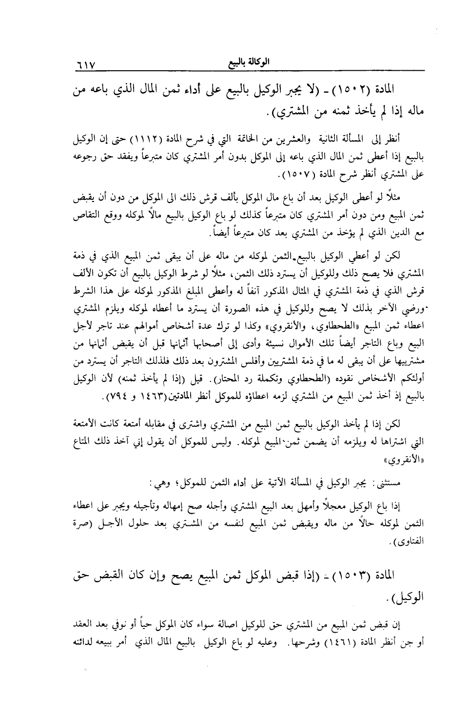 [ (الْمَادَّةُ 1502) لَا يُجْبَرُ الْوَكِيلُ بِالْبَيْعِ عَلَى أَدَاءِ ثَمَنِ الْمَالِ الَّذِي بَاعَهُ مِنْ مَالِهِ]