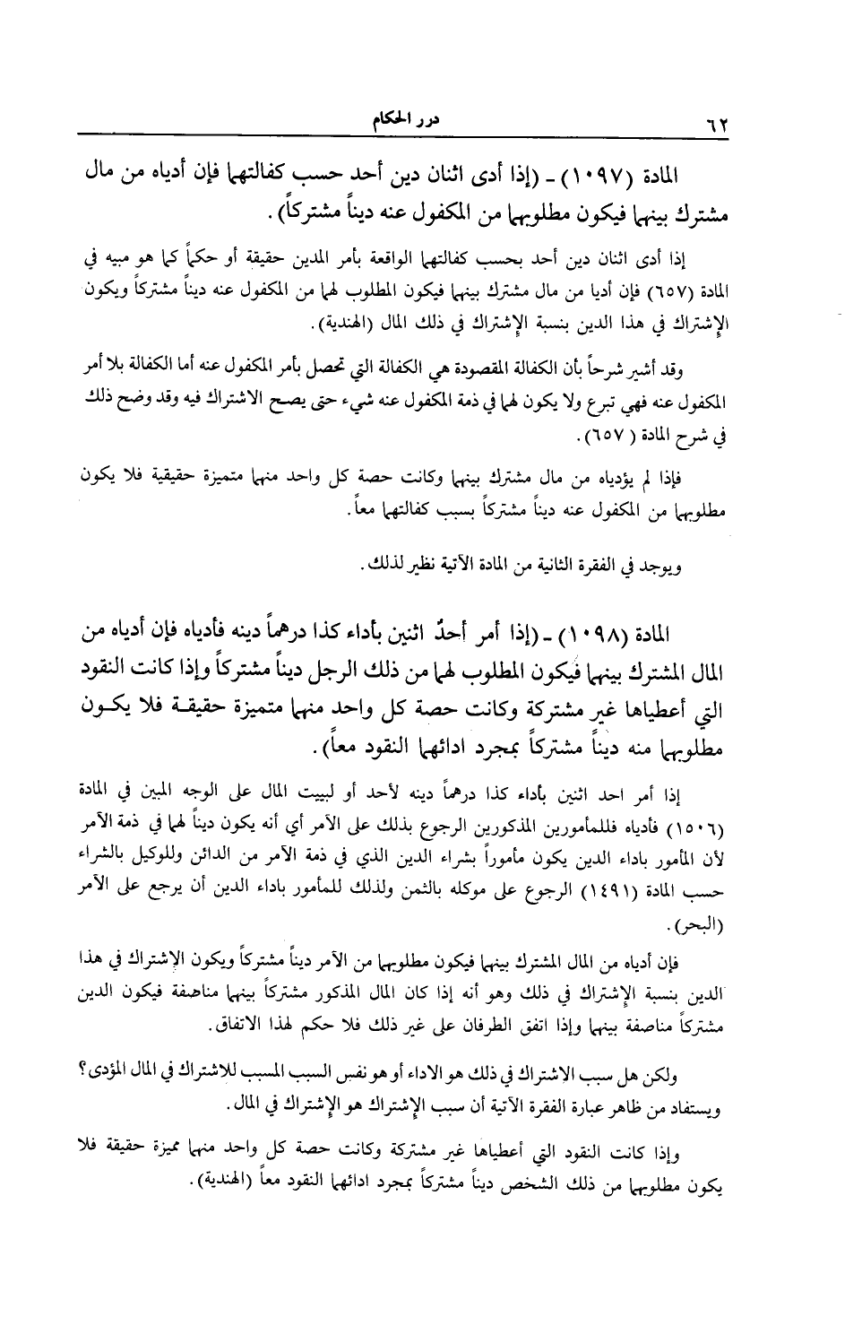 الْمَادَّةُ (1097) - (إذَا أَدَّى اثْنَانِ دَيْنَ أَحَدٍ حَسَبَ كَفَالَتِهِمَا فَإِنْ أَدَّيَاهُ مِنْ مَالٍ مُشْتَرَكٍ بَيْنَهُمَا فَيَكُونُ مَطْلُوبُهُمَا مِنْ الْمَكْفُولِ عَنْهُ دَيْنًا مُشْتَرَكًا) إذَا أَدَّى اثْنَانِ دِينَ أَحَدٍ بِحَسَبِ كَفَالَتِهِمَا الْوَاقِعَةِ بِأَمْرِ الْمَدِينِ حَقِيقَةً أَوْ حُكْمًا كَمَا هُوَ مُبَيَّنٌ فِي الْمَادَّةِ (657) فَإِنْ أَدَّيَا مِنْ مَالٍ مُشْتَرَكٍ بَيْنَهُمَا فَيَكُونُ الْمَطْلُوبُ لَهُمَا مِنْ الْمَكْفُولِ عَنْهُ دَيْنًا مُشْتَرَكًا وَيَكُونُ الِاشْتِرَاكُ فِي هَذَا الدَّيْنِ بِنِسْبَةِ الِاشْتِرَاكِ فِي ذَلِكَ الْمَالِ (الْهِنْدِيَّةُ) . وَقَدْ أُشِيرَ شَرْحًا بِأَنَّ الْكَفَالَةَ الْمَقْصُودَةَ هِيَ الْكَفَالَةُ الَّتِي تَحْصُلُ بِأَمْرِ الْمَكْفُولِ عَنْهُ أَمَّا الْكَفَالَةُ بِلَا أَمْرِ الْمَكْفُولِ عَنْهُ فَهِيَ تَبَرُّعٌ وَلَا يَكُونُ لَهُمَا فِي ذِمَّةِ الْمَكْفُولِ عَنْهُ شَيْءٌ حَتَّى يَصِحَّ الِاشْتِرَاكَ فِيهِ وَقَدْ وُضِّحَ ذَلِكَ فِي شَرْحِ الْمَادَّةِ (657) فَإِذَا لَمْ يُؤَدِّيَاهُ مِنْ مَالٍ مُشْتَرَكٍ بَيْنَهُمَا وَكَانَتْ حِصَّةُ كُلِّ وَاحِدٍ مِنْهُمَا مُتَمَيِّزَةً حَقِيقِيَّةً فَلَا يَكُونُ مَطْلُوبُهُمَا مِنْ الْمَكْفُولِ عَنْهُ دَيْنًا مُشْتَرَكًا بِسَبَبِ كَفَالَتِهِمَا مَعًا وَيُوجَدُ فِي الْفِقْرَةِ الثَّانِيَةِ مِنْ الْمَادَّةِ الْآتِيَةِ نَظِيرٌ لِذَلِكَ.