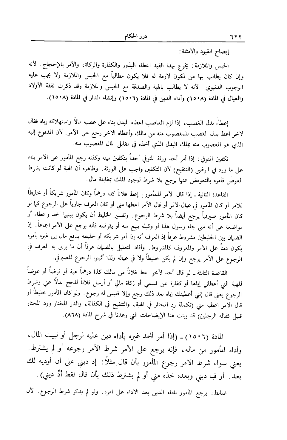 إيضَاحُ الْقُيُودِ وَالْأَمْثِلَةِ: الْحَبْسُ وَالْمُلَازَمَةُ: يَخْرُجُ بِهَذَا الْقَيْدِ إعْطَاءُ النُّذُورِ وَالْكَفَّارَةِ وَالزَّكَاةِ، وَالْأَمْرِ بِالْإِحْجَاجِ؛ لِأَنَّهُ وَإِنْ كَانَ يُطَالَبُ بِهَا مَنْ تَكُونُ لَازِمَةً لَهُ فَلَا يَكُونُ مُطَالَبًا مَعَ الْحَبْسِ وَالْمُلَازَمَةِ وَلَا يَجِبُ عَلَيْهِ الْوُجُوبُ الدُّنْيَوِيُّ؛ لِأَنَّهُ لَا يُطَالَبُ بِالْهِبَةِ وَالصَّدَقَةِ مَعَ الْحَبْسِ وَالْمُلَازَمَةِ وَقَدْ ذُكِرَتْ نَفَقَةُ الْأَوْلَادِ وَالْعِيَالِ فِي الْمَادَّةِ (1508) وَأَدَاءُ الدِّينِ فِي الْمَادَّةِ (1506) وَإِنْشَاءُ الدَّارِ فِي الْمَادَّةِ (1508) . إعْطَاءُ بَدَلِ الْغَصْبِ، إذَا لَزِمَ الْغَاصِبَ إعْطَاءُ الْبَدَلِ بِنَاءً عَلَى غَصْبِهِ مَالًا وَاسْتِهْلَاكِهِ إيَّاهُ فَقَالَ: لِآخَرَ أَعْطِ بَدَلَ الْغَصْبِ لِلْمَغْصُوبِ مِنْهُ مِنْ مَالِكَ وَأَعْطَاهُ الْآخَرُ رَجَعَ عَلَى الْآمِرِ؛ لِأَنَّ الْمَدْفُوعَ إلَيْهِ الَّذِي هُوَ الْمَغْصُوبُ مِنْهُ يَمْلِكُ الْبَدَلَ الَّذِي أَخَذَهُ فِي مُقَابِلِ الْمَالِ الْمَغْصُوبِ مِنْهُ.
