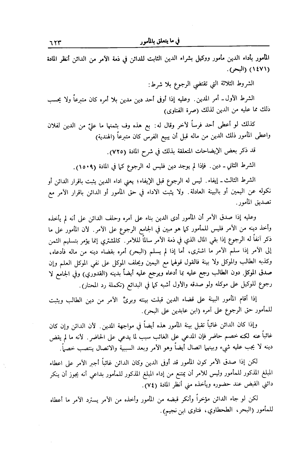 الشُّرُوطُ الثَّلَاثَةُ الَّتِي تَقْتَضِي الرُّجُوعَ بِلَا شَرْطٍ: الشَّرْطُ الْأَوَّلُ - أَمْرُ الْمَدِينِ. وَعَلَيْهِ إذَا أَوْفَى أَحَدٌ دَيْنَ مَدِينٍ بِلَا أَمْرِهِ كَانَ مُتَبَرِّعًا وَلَا يُحْسَبُ ذَلِكَ مِمَّا عَلَيْهِ مِنْ الدَّيْنِ لِذَلِكَ (صُرَّةُ الْفَتَاوَى) كَذَلِكَ لَوْ أَعْطَى أَحَدٌ فَرَسًا لِآخَرَ وَقَالَ: لَهُ: بِعْ هَذِهِ وَفِ بِثَمَنِهَا مَا عَلَيَّ مِنْ الدَّيْنِ لِفُلَانٍ وَأَعْطَى الْمَأْمُورُ ذَلِكَ الدَّيْنَ مِنْ مَالِهِ قَبْلَ أَنْ يَبِيعَ الْفَرَسَ كَانَ مُتَبَرِّعًا (الْهِنْدِيَّةُ) قَدْ ذَكَرَ بَعْضَ الْإِيضَاحَاتِ الْمُتَعَلِّقَةِ بِذَلِكَ فِي شَرْحِ الْمَادَّةِ (725) . الشَّرْطُ الثَّانِي - دَيْنٌ، فَإِذَا لَمْ يُوجَدْ دَيْنٌ فَلَيْسَ لَهُ الرُّجُوعُ كَمَا فِي الْمَادَّةِ (1509) . الشَّرْطُ الثَّالِثُ - إيفَاءٌ. لَيْسَ لَهُ الرُّجُوعُ قَبْلَ الْإِيفَاءِ؛ يَعْنِي أَدَاءَ الدَّيْنِ يَثْبُتُ بِإِقْرَارِ الدَّائِنِ أَوْ نُكُولِهِ عَنْ الْيَمِينِ أَوْ بِالْبَيِّنَةِ الْعَادِلَةِ وَلَا يَثْبُتُ الْأَدَاءُ فِي حَقِّ الْمَأْمُورِ أَوْ الدَّائِنِ بِإِقْرَارِ الْآمِرِ مَعَ تَصْدِيقِ الْمَأْمُورِ. وَعَلَيْهِ إذَا صَدَّقَ الْآمِرُ أَنَّ الْمَأْمُورَ أَدَّى الدَّيْنَ بِنَاءً عَلَى أَمْرِهِ وَحَلَفَ الدَّائِنُ عَلَى أَنَّهُ لَمْ يَأْخُذُهُ وَأَخَذَ دَيْنَهُ مِنْ الْآمِرِ فَلَيْسَ لِلْمَأْمُورِ كَمَا هُوَ مُبَيَّنٌ فِي الْجَامِعِ الرُّجُوعُ عَلَى الْآمِرِ؛ لِأَنَّ الْمَأْمُورَ عَلَى مَا ذُكِرَ آنِفًا لَهُ الرُّجُوعُ إذَا بَقِيَ الْمَالُ الَّذِي فِي ذِمَّةِ الْآمِرِ سَالِمًا لِلْآمِرِ. كَالْمُشْتَرِي إنَّمَا يُؤْمَرُ بِتَسْلِيمِ الثَّمَنِ إلَى الْآمِرِ إذَا سَلَّمَ الْآمِرُ مَا اشْتَرَى.