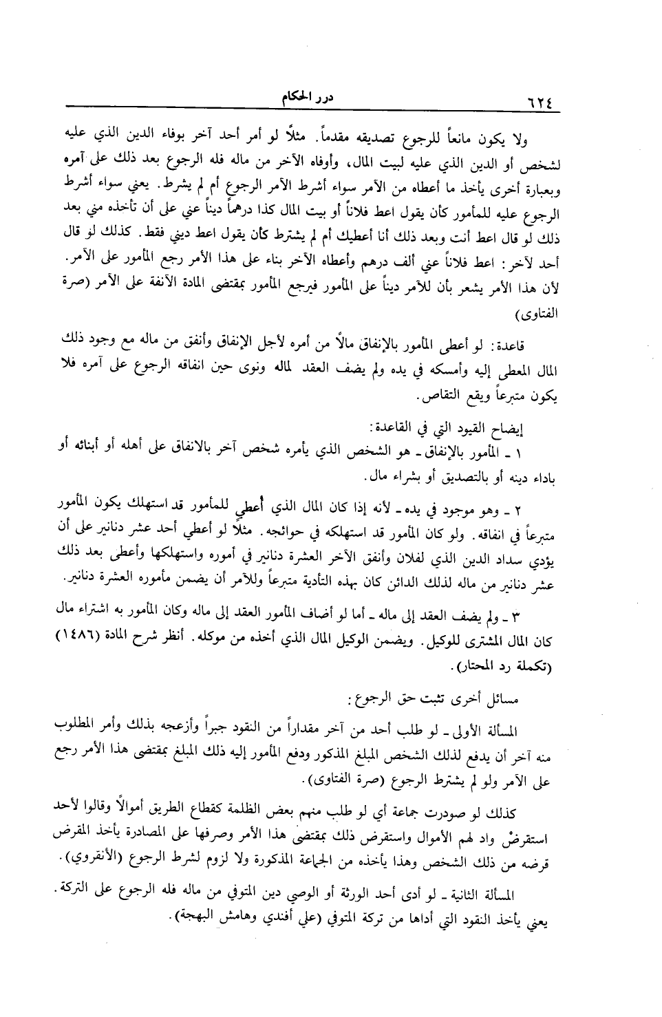 مَثَلًا لَوْ أَمَرَ أَحَدٌ آخَرَ بِوَفَاءِ الدَّيْنِ الَّذِي عَلَيْهِ لِشَخْصٍ أَوْ الدَّيْنِ الَّذِي عَلَيْهِ لِبَيْتِ الْمَالِ، وَأَوْفَاهُ الْآخَرُ مِنْ مَالِهِ فَلَهُ الرُّجُوعُ بَعْدَ ذَلِكَ عَلَى آمِرِهِ وَبِعِبَارَةٍ أُخْرَى يَأْخُذُ مَا أَعْطَاهُ مِنْ الْآمِرِ سَوَاءٌ أَشَرَطَ الْآمِرُ الرُّجُوعَ أَمْ لَمْ يَشْرُطْ. يَعْنِي سَوَاءٌ أَشَرَطَ الرُّجُوعَ عَلَيْهِ لِلْمَأْمُورِ كَأَنْ يَقُولَ: أَعْطِ فُلَانًا أَوْ بَيْتَ الْمَالِ كَذَا دِرْهَمًا دَيْنًا عَنِّي عَلَى أَنْ تَأْخُذَهُ مِنِّي بَعْدَ ذَلِكَ لَوْ قَالَ: أَعْطِ أَنْتَ وَبَعْدَ ذَلِكَ أَنَا أُعْطِيَك أَمْ لَمْ يَشْتَرِطْ كَأَنْ يَقُولَ: أَعْطِ دَيْنِي فَقَطْ. كَذَلِكَ لَوْ قَالَ: أَحَدٌ لِآخَرَ: أَعْطِ فُلَانًا عَنِّي أَلْفَ دِرْهَمٍ وَأَعْطَاهُ الْآخَرُ بِنَاءً عَلَى هَذَا الْأَمْرِ رَجَعَ الْمَأْمُورُ عَلَى الْآمِرِ؛ لِأَنَّ هَذَا الْأَمْرَ يُشْعِرُ بِأَنَّ لِلْآمِرِ دَيْنًا عَلَى الْمَأْمُورِ فَيَرْجِعُ الْمَأْمُورُ بِمُقْتَضَى الْمَادَّةِ الْآنِفَةِ عَلَى الْآمِرِ (صُرَّةُ الْفَتَاوَى) قَاعِدَةٌ: لَوْ أَعْطَى الْمَأْمُورُ بِالْإِنْفَاقِ مَالًا مِنْ أَمْرِهِ لِأَجْلِ الْإِنْفَاقِ وَأَنْفَقَ مِنْ مَالِهِ مَعَ وُجُودِ ذَلِكَ الْمَالِ الْمُعْطَى إلَيْهِ وَأَمْسَكَهُ فِي يَدِهِ وَلَمْ يُضِفْ الْعَقْدَ لِمَالِهِ وَنَوَى حِينَ إنْفَاقِهِ الرُّجُوعَ عَلَى آمِرِهِ فَلَا يَكُونُ مُتَبَرِّعًا وَيَقَعُ التَّقَاصُّ.