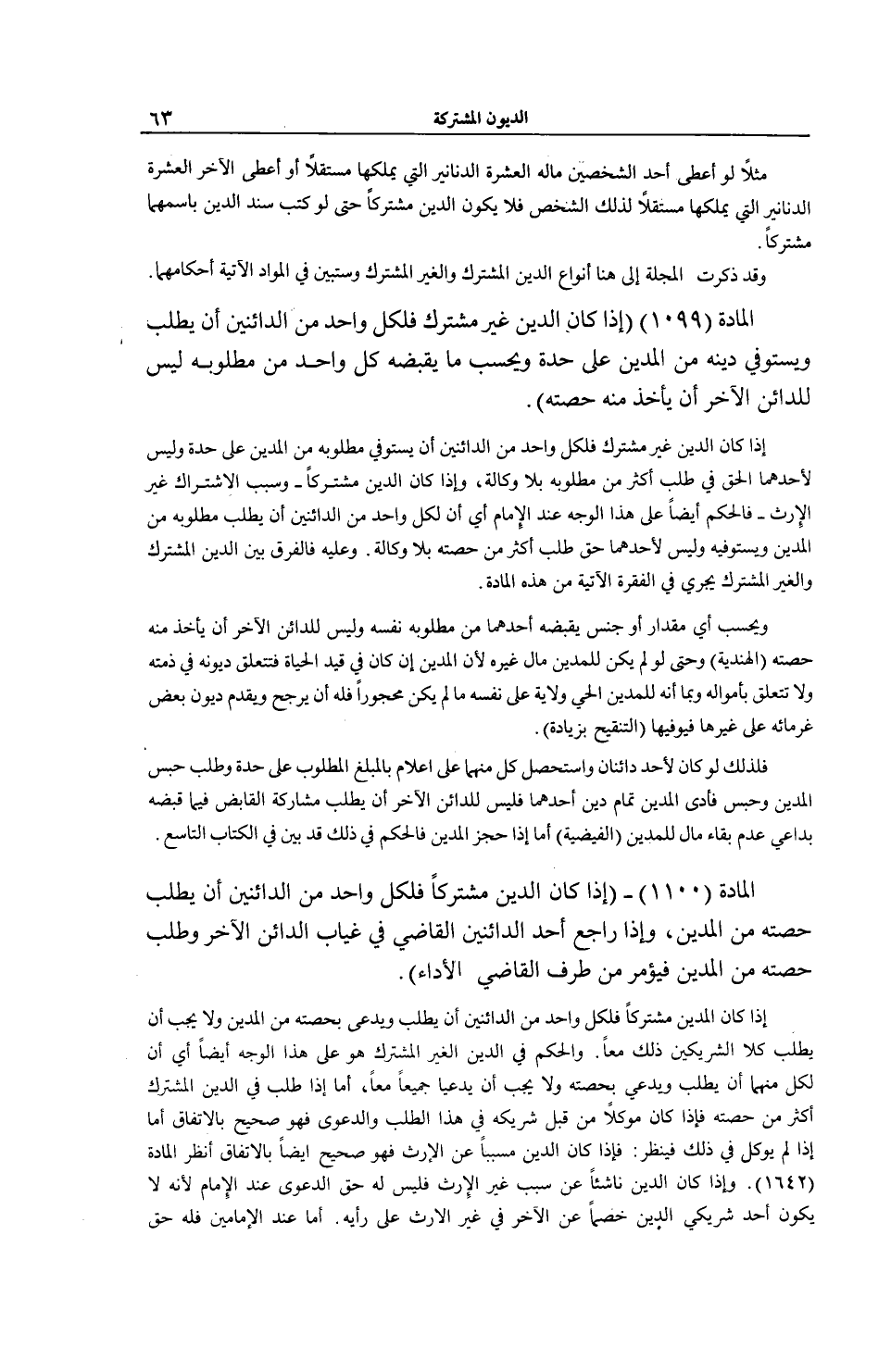 مَثَلًا لَوْ أَعْطَى أَحَدُ الشَّخْصَيْنِ مَالَهُ الْعَشَرَةَ الدَّنَانِيرَ الَّتِي يَمْلِكُهَا مُسْتَقِلًّا أَوْ أَعْطَى الْآخَرُ الْعَشَرَةَ الدَّنَانِيرَ الَّتِي يَمْلِكُهَا مُسْتَقِلًّا لِذَلِكَ الشَّخْصِ فَلَا يَكُونُ الدَّيْنُ مُشْتَرَكًا حَتَّى لَوْ كُتِبَ سَنَدُ الدَّيْنِ بِاسْمِهِمَا مُشْتَرَكًا. وَقَدْ ذَكَرَتْ الْمَجَلَّةُ إلَى هُنَا أَنْوَاعَ الدَّيْنِ الْمُشْتَرَكِ وَالْغَيْرِ الْمُشْتَرَكِ وَسَتُبَيِّنُ فِي الْمَوَادِّ الْآتِيَةِ أَحْكَامَهُمَا. .