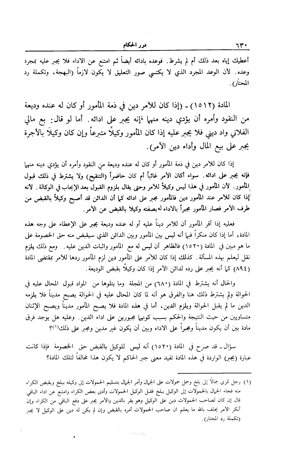 سُؤَالٌ - قَدْ صَرَّحَ فِي الْمَادَّةِ (1520) أَنَّهُ لَيْسَ لِلْوَكِيلِ بِالْقَبْضِ حَقُّ الْخُصُومَةِ، فَإِذَا كَانَتْ عِبَارَةُ (يُجْبَرُ) الْوَارِدَةُ فِي هَذِهِ الْمَادَّةِ تُفِيدُ مَعْنَى جَبْرِ الْحَاكِمِ أَلَّا يَكُونُ هَذَا مُخَالِفًا لِتِلْكَ الْمَادَّةِ؟