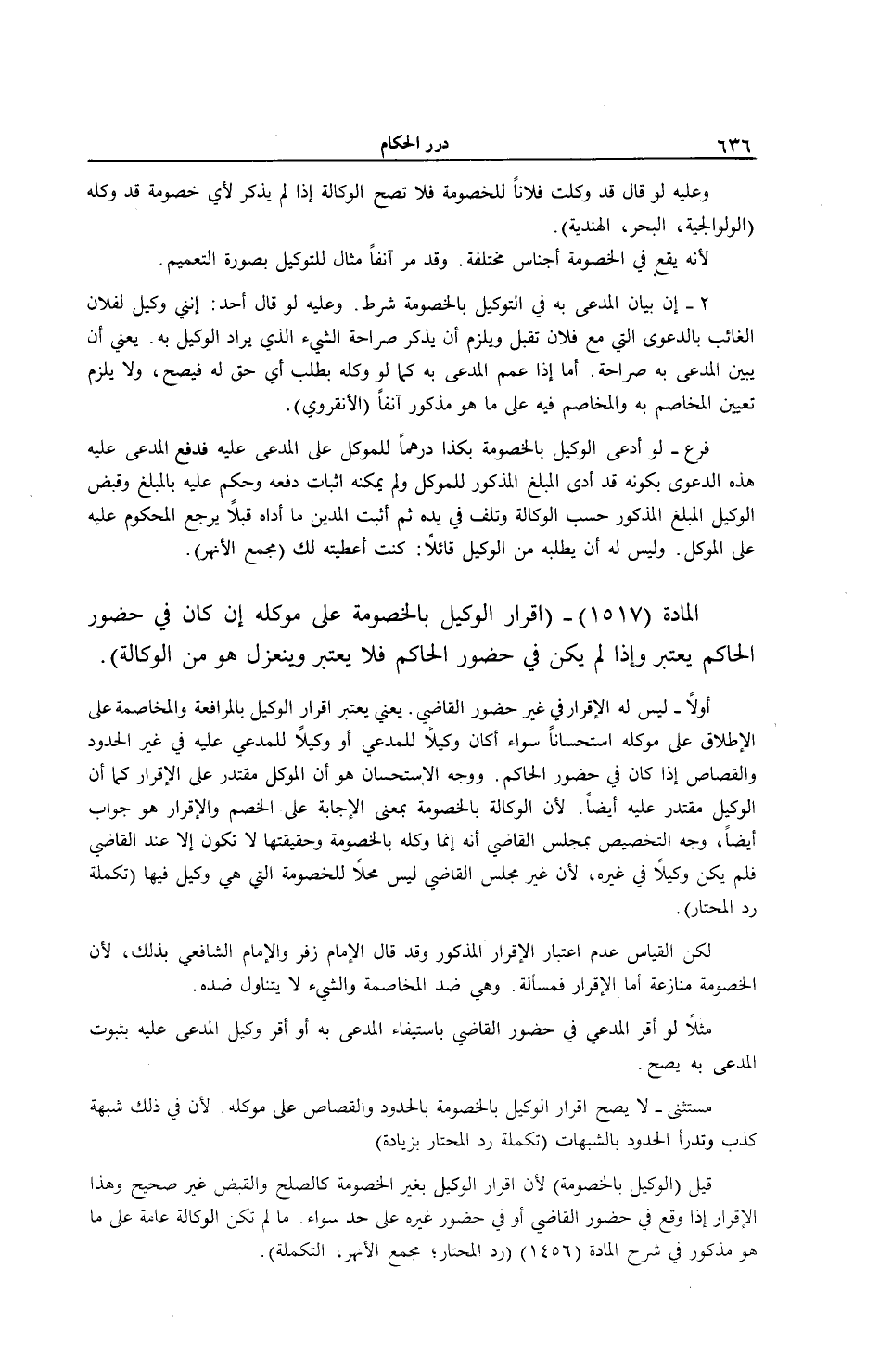 الْمَادَّةُ (1517) - (إقْرَارُ الْوَكِيلِ بِالْخُصُومَةِ عَلَى مُوَكِّلِهِ إنْ كَانَ فِي حُضُورِ الْحَاكِمِ يُعْتَبَرُ وَإِذَا لَمْ يَكُنْ فِي حُضُورِ الْحَاكِمِ فَلَا يُعْتَبَرُ وَيَنْعَزِلُ هُوَ مِنْ الْوَكَالَةِ) . أَوَّلًا - لَيْسَ لَهُ الْإِقْرَارُ فِي غَيْرِ حُضُورِ الْقَاضِي. يَعْنِي يُعْتَبَرُ إقْرَارُ الْوَكِيلِ بِالْمُرَافَعَةِ وَالْمُخَاصَمَةِ عَلَى الْإِطْلَاقِ عَلَى مُوَكِّلِهِ اسْتِحْسَانًا سَوَاءٌ أَكَانَ وَكِيلًا لِلْمُدَّعِي أَوْ وَكِيلًا لِلْمُدَّعَى عَلَيْهِ فِي غَيْرِ الْحُدُودِ وَالْقِصَاصِ إذَا كَانَ فِي حُضُورِ الْحَاكِمِ. وَوَجْهُ الِاسْتِحْسَانِ هُوَ أَنَّ الْمُوَكِّلَ مُقْتَدِرٌ عَلَى الْإِقْرَارِ كَمَا أَنَّ الْوَكِيلَ مُقْتَدِرٌ عَلَيْهِ أَيْضًا؛ لِأَنَّ الْوَكَالَةَ بِالْخُصُومَةِ بِمَعْنَى الْإِجَابَةِ عَلَى الْخَصْمِ وَالْإِقْرَارُ هُوَ جَوَابٌ أَيْضًا، وَجْهُ التَّخْصِيصِ بِمَجْلِسِ الْقَاضِي أَنَّهُ إنَّمَا وَكَّلَهُ بِالْخُصُومَةِ وَحَقِيقَتُهَا لَا تَكُونُ إلَّا عِنْدَ الْقَاضِي فَلَمْ يَكُنْ وَكِيلًا فِي غَيْرِهِ؛ لِأَنَّ غَيْرَ مَجْلِسِ الْقَاضِي لَيْسَ مَحَلًّا لِلْخُصُومَةِ الَّتِي هُوَ وَكِيلٌ فِيهَا (تَكْمِلَةُ رَدِّ الْمُحْتَارِ) . لَكِنَّ الْقِيَاسَ عَدَمُ اعْتِبَارِ الْإِقْرَارِ الْمَذْكُورِ وَقَدْ قَالَ: الْإِمَامُ زُفَرُ وَالْإِمَامُ الشَّافِعِيُّ بِذَلِكَ؛ لِأَنَّ الْخُصُومَةَ مُنَازَعَةٌ أَمَّا الْإِقْرَارُ فَمَسْأَلَةٌ.