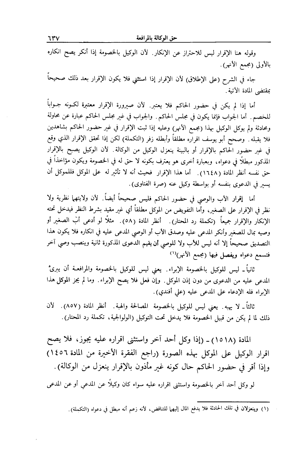الْمَادَّةُ (1518) - (إذَا وَكَّلَ أَحَدٌ آخَرَ وَاسْتَثْنَى إقْرَارَهُ عَلَيْهِ يَجُوزُ، فَلَا يَصِحُّ إقْرَارُ الْوَكِيلِ عَلَى الْمُوَكِّلِ بِهَذِهِ الصُّورَةِ (رَاجِعْ الْفِقْرَةَ الْأَخِيرَةَ مِنْ الْمَادَّةِ 1456) وَإِذَا أَقَرَّ فِي حُضُورِ الْحَاكِمِ حَالٍ كَوْنِهِ غَيْرَ مَأْذُونٍ بِالْإِقْرَارِ يَنْعَزِلُ مِنْ الْوَكَالَةِ) . لَوْ وَكَّلَ أَحَدٌ آخَرَ بِالْخُصُومَةِ وَاسْتَثْنَى إقْرَارَهُ عَلَيْهِ سَوَاءٌ كَانَ وَكِيلًا عَنْ الْمُدَّعِي أَوْ عَنْ الْمُدَّعَى