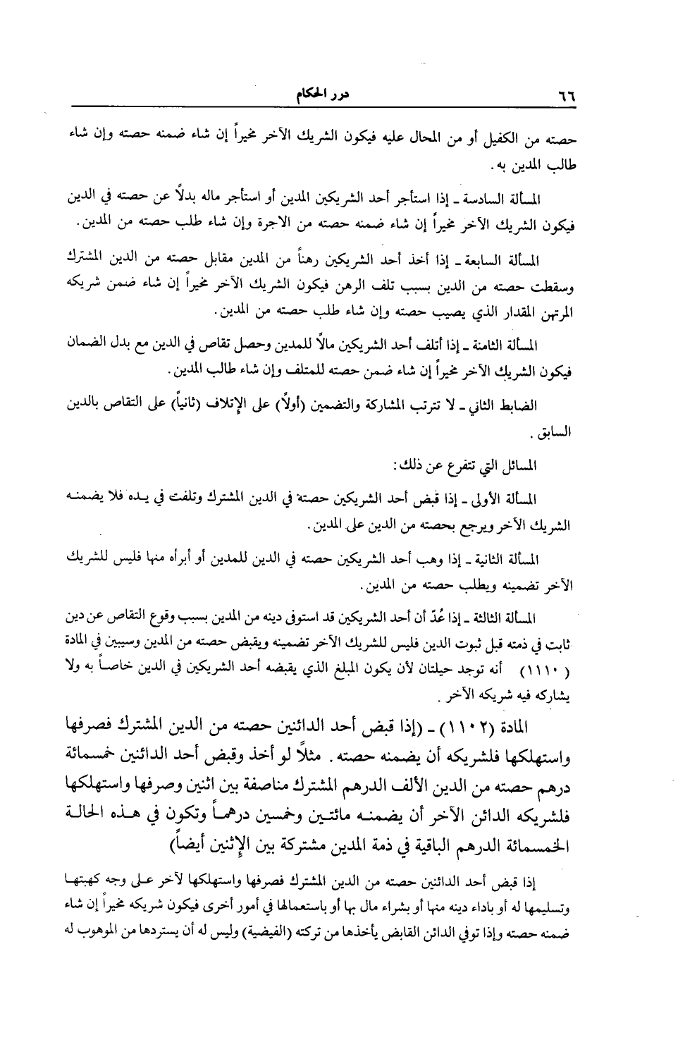 الْمَسْأَلَةُ الثَّالِثَةُ - إذَا عُدَّ أَنَّ أَحَدَ الشَّرِيكَيْنِ قَدْ اسْتَوْفَى دَيْنَهُ مِنْ الْمَدِينِ بِسَبَبِ وُقُوعِ التَّقَاصِّ عَنْ دَيْنٍ ثَابِتٍ فِي ذِمَّتِهِ قَبْلَ ثُبُوتِ الدَّيْنِ فَلَيْسَ لِلشَّرِيكِ الْآخَرِ تَضْمِينُهُ وَيَقْبِضُ حِصَّتَهُ مِنْ الْمَدِينِ وَسَيُبَيَّنُ فِي الْمَادَّةِ (0 1 1 1) أَنَّهُ تُوجَدُ حِيلَتَانِ لَأَنْ يَكُونَ الْمَبْلَغُ الَّذِي يَقْبِضُهُ أَحَدُ الشَّرِيكَيْنِ فِي الدَّيْنِ خَاصًّا بِهِ وَلَا يُشَارِكُهُ فِيهِ شَرِيكُهُ الْآخَرُ.