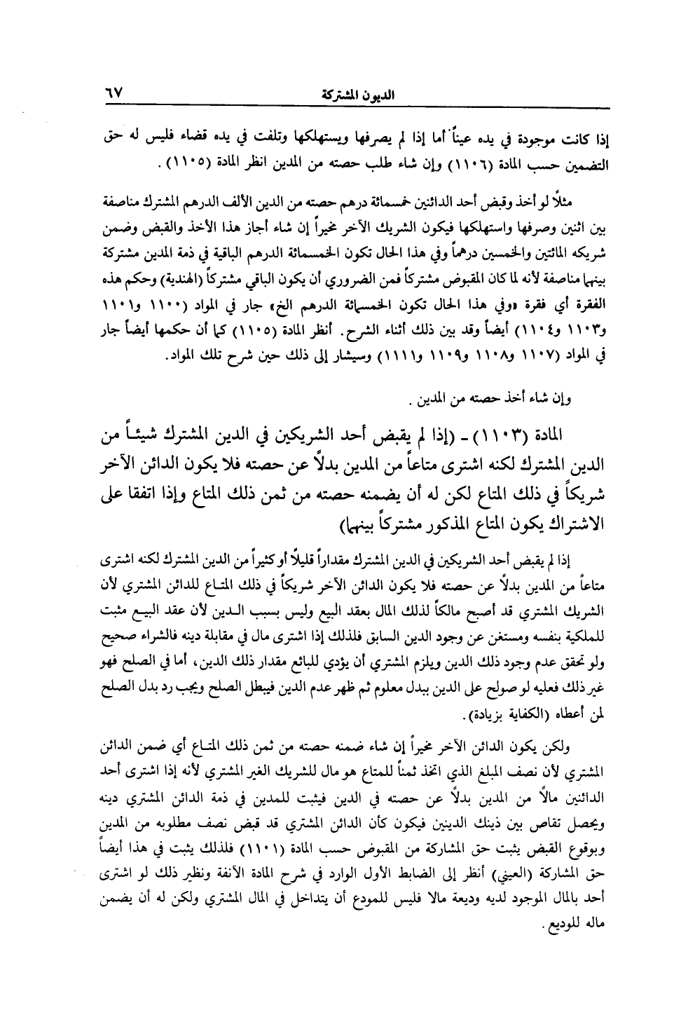 مَثَلًا لَوْ أَخَذَ وَقَبَضَ أَحَدُ الدَّائِنَيْنِ خَمْسَمِائَةِ دِرْهَمٍ حِصَّتَهُ مِنْ الدَّيْنِ الْأَلْفِ الدِّرْهَمِ الْمُشْتَرَكِ مُنَاصَفَةً بَيْنَ اثْنَيْنِ وَصَرَفَهَا وَاسْتَهْلَكَهَا فَيَكُونُ الشَّرِيكُ الْآخَرُ مُخَيَّرًا إنْ شَاءَ أَجَازَ هَذَا الْأَخْذَ وَالْقَبْضَ وَضَمَّنَ شَرِيكَهُ الْمِائَتَيْنِ وَالْخَمْسِينَ دِرْهَمًا وَفِي هَذَا الْحَالِ تَكُونُ الْخَمْسُمِائَةِ الدِّرْهَمِ الْبَاقِيَةُ فِي ذِمَّةِ الْمَدِينِ مُشْتَرَكَةً بَيْنَهُمَا مُنَاصَفَةً لِأَنَّهُ لَمَّا كَانَ الْمَقْبُوضُ مُشْتَرَكًا فَمِنْ الضَّرُورِيِّ أَنْ يَكُونَ الْبَاقِي مُشْتَرَكًا (الْهِنْدِيَّةُ) وَحُكْمُ هَذِهِ الْفِقْرَةِ أَيْ فِقْرَةِ (وَفِي هَذَا الْحَالِ تَكُونُ الْخَمْسُمِائَةِ الدِّرْهَمُ إلَخْ) جَارٍ فِي الْمَوَادِّ (00 1 1 و 1 0 1 1 و 3 11 و 4 0 1 1) أَيْضًا وَقَدْ بُيِّنَ ذَلِكَ أَثْنَاءَ الشَّرْحِ. اُنْظُرْ الْمَادَّةَ (5 0 1 1) كَمَا أَنَّ حُكْمَهَا أَيْضًا جَارٍ فِي الْمَوَادِّ (7 11 و 8 1 1 و 9 1 1 و 1 1 1 1) وَسَيُشَارُ إلَى ذَلِكَ حِينَ شَرَحَ تِلْكَ الْمَوَادَّ. وَإِنْ شَاءَ أَخَذَ حِصَّتَهُ مِنْ الْمَدِينِ.