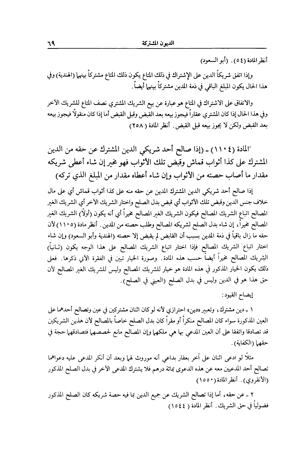 2 - عَنْ حَقِّهِ، أَمَّا إذَا تَصَالَحَ الشَّرِيكُ عَنْ جَمِيعِ الدَّيْنِ بِمَا فِيهِ حِصَّةُ شَرِيكِهِ كَانَ الصُّلْحُ الْمَذْكُورُ فُضُولِيًّا فِي حَقِّ الشَّرِيكِ. اُنْظُرْ الْمَادَّةَ (4 4 5 1) .