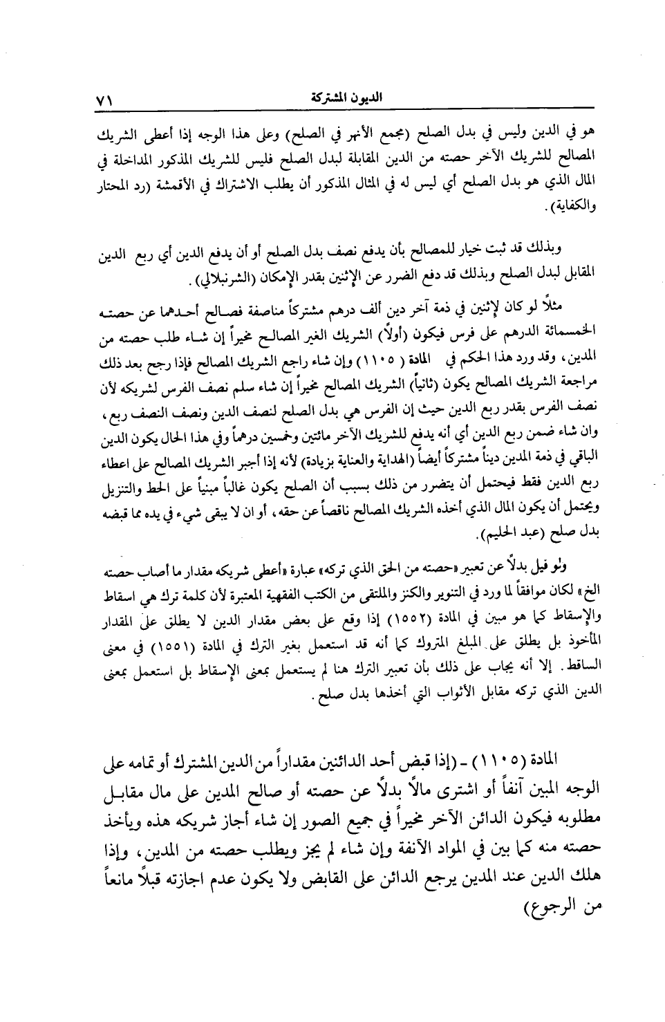 وَلَوْ قِيلَ بَدَلًا عَنْ تَعْبِيرِ (حِصَّتِهِ مِنْ الْحَقِّ الَّذِي تَرَكَهُ) عِبَارَةُ (أَعْطَى شَرِيكَهُ مِقْدَارَ مَا أَصَابَ حِصَّتَهُ إلَخْ) لَكَانَ مُوَافِقًا لِمَا وَرَدَ فِي التَّنْوِيرِ وَالْكَنْزِ وَالْمُلْتَقَى مِنْ الْكُتُبِ الْفِقْهِيَّةِ الْمُعْتَبَرَةِ لِأَنَّ كَلِمَةَ تَرَكَ هِيَ إسْقَاطٌ وَالْإِسْقَاطُ كَمَا هُوَ مُبَيَّنٌ فِي الْمَادَّةِ (1552) إذَا وَقَعَ عَلَى بَعْضٍ مِقْدَارَ الدَّيْنِ لَا يُطْلَقُ عَلَى الْمِقْدَارِ الْمَأْخُوذِ بَلْ يُطْلَقُ عَلَى الْمَبْلَغِ الْمَتْرُوكِ كَمَا أَنَّهُ قَدْ اُسْتُعْمِلَ بِغَيْرِ التَّرْكِ فِي الْمَادَّةِ (1551) فِي مَعْنَى السَّاقِطِ. إلَّا أَنَّهُ يُجَابُ عَلَى ذَلِكَ بِأَنَّ تَعْبِيرَ التَّرْكِ هُنَا لَمْ يُسْتَعْمَلْ بِمَعْنَى الْإِسْقَاطِ بَلْ اُسْتُعْمِلَ بِمَعْنَى الدَّيْنِ الَّذِي تَرَكَهُ مُقَابِلَ الْأَثْوَابِ الَّتِي أَخَذَهَا بَدَلَ صُلْحٍ.