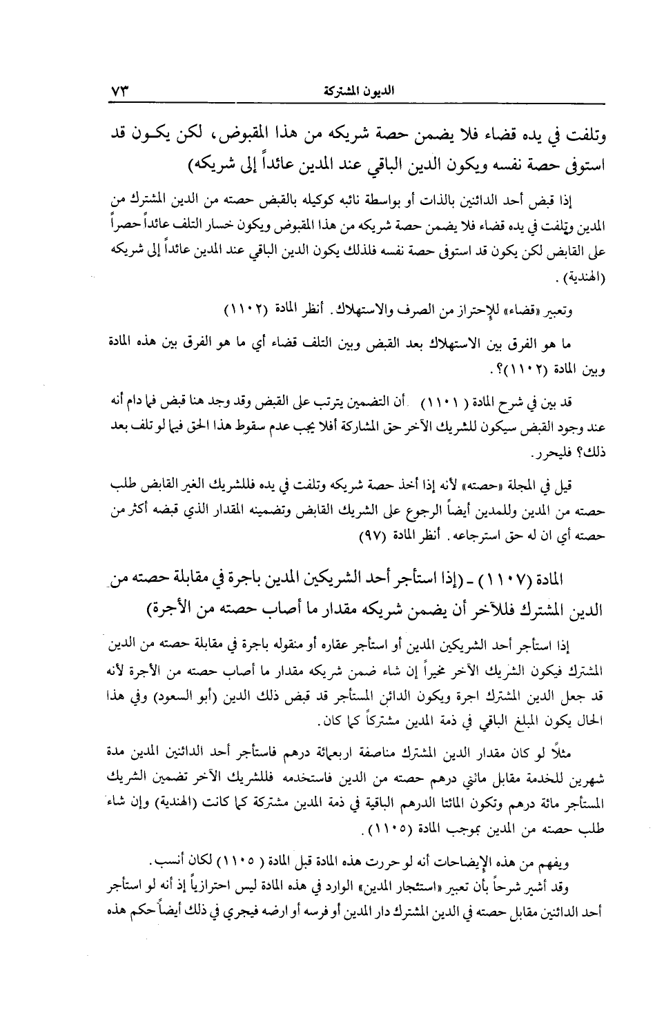 وَتَعْبِيرُ ((قَضَاءً)) لِلِاحْتِرَازِ مِنْ الصَّرْفِ وَالِاسْتِهْلَاكِ. اُنْظُرْ الْمَادَّةَ (2 0 1 1) مَا هُوَ الْفَرْقُ بَيْنَ الِاسْتِهْلَاكِ بَعْدَ الْقَبْضِ وَبَيْنَ التَّلَفِ قَضَاءً أَيْ مَا هُوَ الْفَرْقُ بَيْنَ هَذِهِ الْمَادَّةِ وَبَيْنَ الْمَادَّةِ (2 0 1 1) ؟ قَدْ بِينَ فِي شَرْحِ الْمَادَّةِ (1 0 1 1) أَنَّ التَّضْمِينَ يَتَرَتَّبُ عَلَى الْقَبْضِ وَقَدْ وُجِدَ هُنَا قَبْضٌ فَمَا دَامَ أَنَّهُ عِنْدَ وُجُودِ الْقَبْضِ سَيَكُونُ لِلشَّرِيكِ الْآخَرِ حَقُّ الْمُشَارَكَةِ أَفَلَا يَجِبُ عَدَمُ سُقُوطِ هَذَا الْحَقِّ فِيمَا لَوْ تَلِفَ بَعْدَ ذَلِكَ؟ فَلْيُحَرَّرْ. قِيلَ فِي الْمَجَلَّةِ (حِصَّتُهُ) لِأَنَّهُ إذَا أَخَذَ حِصَّةَ شَرِيكِهِ وَتَلِفَتْ فِي يَدِهِ فَلِلشَّرِيكِ الْغَيْرِ الْقَابِضِ طَلَبُ حِصَّتِهِ مِنْ الْمَدِينِ وَلِلْمَدِينِ أَيْضًا الرُّجُوعُ عَلَى الشَّرِيكِ الْقَابِضِ وَتَضْمِينُهُ الْمِقْدَارَ الَّذِي قَبَضَهُ أَكْثَرَ مِنْ حِصَّتِهِ أَكْثَرَ أَنَّ لَهُ حَقَّ اسْتِرْجَاعِهِ. اُنْظُرْ الْمَادَّةَ (97) .