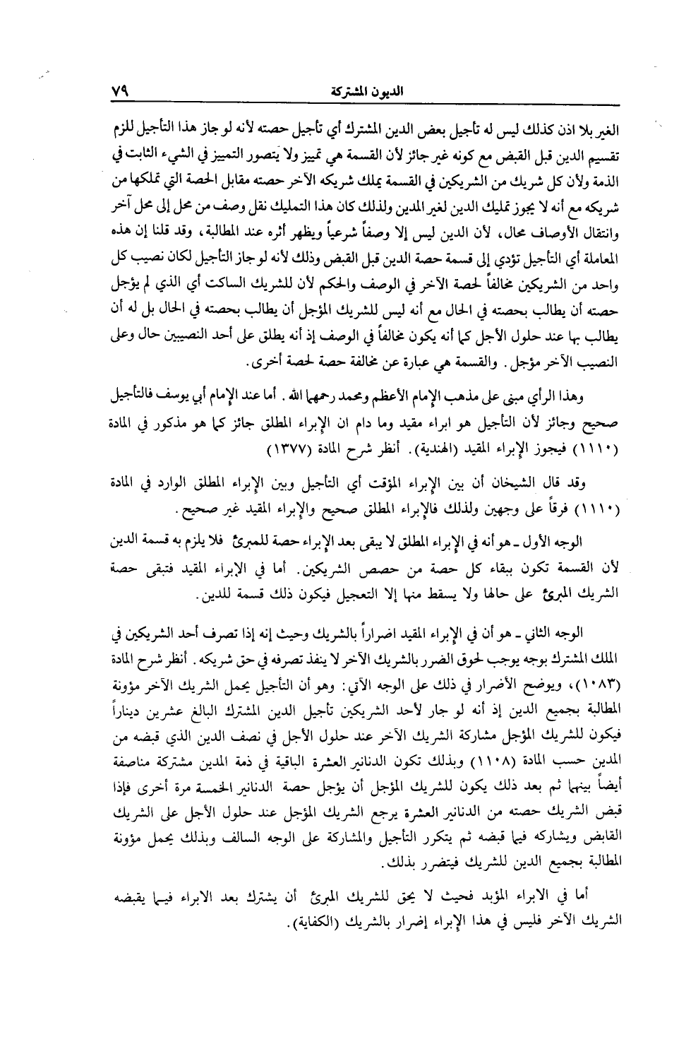 الْغَيْرِ بِلَا إذْنٍ، كَذَلِكَ لَيْسَ لَهُ تَأْجِيلُ بَعْضِ الدَّيْنِ الْمُشْتَرَكِ أَيْ تَأْجِيلُ حِصَّتِهِ لِأَنَّهُ لَوْ جَازَ هَذَا التَّأْجِيلُ لَلَزِمَ تَقْسِيمُ الدَّيْنِ قَبْلَ الْقَبْضِ مَعَ كَوْنِهِ غَيْرَ جَائِزٍ لِأَنَّ الْقِسْمَةَ هِيَ تَمْيِيزٌ وَلَا يُتَصَوَّرُ التَّمْيِيزُ فِي الشَّيْءِ الثَّابِتِ فِي الذِّمَّةِ وَلِأَنَّ كُلَّ شَرِيكٍ مِنْ الشَّرِيكَيْنِ فِي الْقِسْمَةِ يَمْلِكُ شَرِيكَهُ الْآخَرَ حِصَّتَهُ مُقَابِلَ الْحِصَّةِ الَّتِي تَمَلَّكَهَا مِنْ شَرِيكِهِ مَعَ أَنَّهُ لَا يَجُوزُ تَمْلِيكُ الدَّيْنِ لِغَيْرِ الْمَدِينِ وَلِذَلِكَ كَانَ هَذَا التَّمْلِيكُ نَقْلُ وَصْفٍ مِنْ مَحَلٍّ إلَى مَحَلٍّ آخَرَ وَانْتِقَالُ الْأَوْصَافِ مُحَالٌ، لِأَنَّ الدَّيْنَ لَيْسَ إلَّا وَصْفًا شَرْعِيًّا وَيَظْهَرُ أَثَرُهُ عِنْدَ الْمُطَالَبَةِ، وَقَدْ قُلْنَا إنَّ هَذِهِ الْمُعَامَلَةَ أَيْ التَّأْجِيلَ تُؤَدِّي إلَى قِسْمَةِ حِصَّةِ الدَّيْنِ قَبْلَ الْقَبْضِ وَذَلِكَ لِأَنَّهُ لَوْ جَازَ التَّأْجِيلُ لَكَانَ نَصِيبُ كُلِّ وَاحِدٍ مِنْ الشَّرِيكَيْنِ مُخَالِفًا لِحِصَّةِ الْآخَرِ فِي الْوَصْفِ وَالْحُكْمِ لِأَنَّ لِلشَّرِيكِ السَّاكِتِ أَيْ الَّذِي لَمْ يُؤَجِّلْ حِصَّتَهُ أَنْ يُطَالِبَ بِحِصَّتِهِ فِي الْحَالِ مَعَ أَنَّهُ لَيْسَ لِلشَّرِيكِ الْمُؤَجِّلِ أَنْ يُطَالِبَ بِحِصَّتِهِ فِي الْحَالِ بَلْ لَهُ أَنْ يُطَالِبَ بِهَا عِنْدَ حُلُولِ الْأَجَلِ كَمَا أَنَّهُ يَكُونُ مُخَالِفًا فِي الْوَصْفِ إذْ إنَّهُ يُطْلَقُ عَلَى أَحَدِ النَّصِيبَيْنِ: حَالٌّ، وَعَلَى النَّصِيبِ الْآخَرِ: مُؤَجَّلٌ، وَالْقِسْمَةُ هِيَ عِبَارَةٌ عَنْ مُخَالَفَةِ حِصَّةٍ لِحِصَّةٍ أُخْرَى. وَهَذَا الرَّأْيُ مَبْنِيٌّ عَلَى مَذْهَبِ الْإِمَامِ الْأَعْظَمِ وَمُحَمَّدٍ رَحِمَهُمَا اللَّهُ. أَمَّا عِنْدَ الْإِمَامِ أَبِي يُوسُفَ فَالتَّأْجِيلُ صَحِيحٌ وَجَائِزٌ لِأَنَّ التَّأْجِيلَ هُوَ إبْرَاءٌ مُقَيَّدٌ وَمَا دَامَ أَنَّ الْإِبْرَاءَ الْمُطْلَقَ جَائِزٌ كَمَا هُوَ مَذْكُورٌ فِي الْمَادَّةِ (0 1 1 1) فَيَجُوزُ الْإِبْرَاءُ الْمُقَيَّدُ (الْهِنْدِيَّةُ) . اُنْظُرْ شَرْحَ الْمَادَّةِ (1377) وَقَدْ قَالَ الشَّيْخَانِ إنَّ بَيْنَ الْإِبْرَاءِ الْمُؤَقَّتِ أَيْ التَّأْجِيلِ وَبَيْنَ الْإِبْرَاءِ الْمُطْلَقِ الْوَارِدِ فِي الْمَادَّةِ (1 1 1) فَرْقًا عَلَى وَجْهَيْنِ، وَلِذَلِكَ فَالْإِبْرَاءُ الْمُطْلَقُ صَحِيحٌ وَالْإِبْرَاءُ الْمُقَيَّدُ غَيْرُ صَحِيحٍ. الْوَجْهُ الْأَوَّلُ - هُوَ أَنَّهُ فِي الْإِبْرَاءِ الْمُطْلَقِ لَا يَبْقَى بَعْدَ الْإِبْرَاءِ حِصَّةٌ لِلْمُبْرِئِ فَلَا يَلْزَمُ بِهِ قِسْمَةُ الدَّيْنِ لِأَنَّ الْقِسْمَةَ تَكُونُ بِبَقَاءِ كُلِّ حِصَّةٍ مِنْ حِصَصِ الشَّرِيكَيْنِ. أَمَّا فِي الْإِبْرَاءِ الْمُقَيَّدِ فَتَبْقَى حِصَّةُ الشَّرِيكِ الْمُبْرِئِ عَلَى حَالِهَا وَلَا يَسْقُطُ مِنْهَا إلَّا التَّعْجِيلُ فَيَكُونُ ذَلِكَ قِسْمَةً لِلدَّيْنِ.