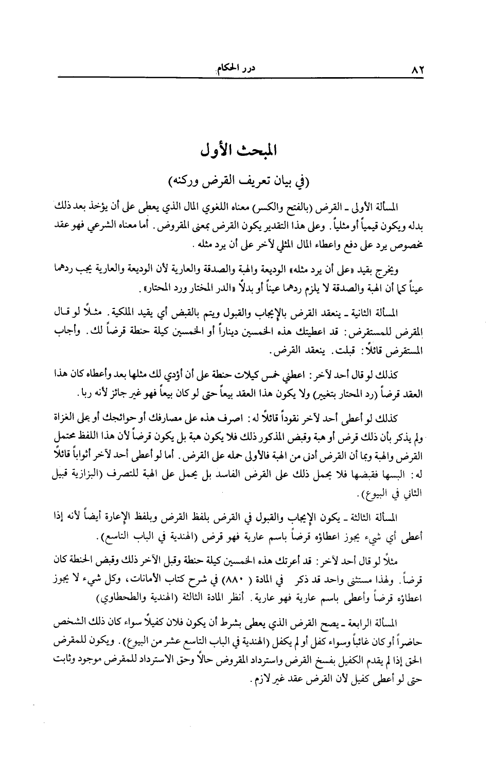 الْمَبْحَثُ الْأَوَّلُ (فِي بَيَانِ تَعْرِيفِ الْقَرْضِ وَرُكْنِهِ) الْمَسْأَلَةُ الْأُولَى - الْقَرْضُ (بِالْفَتْحِ، وَالْكَسْرِ) مَعْنَاهُ اللُّغَوِيُّ: الْمَالُ الَّذِي يُعْطَى عَلَى أَنْ يُؤْخَذَ بَعْدَ ذَلِكَ بَدَلُهُ، وَيَكُونُ قِيَمِيًّا أَوْ مِثْلِيًّا. وَعَلَى هَذَا التَّقْدِيرِ يَكُونُ الْقَرْضُ بِمَعْنَى الْمَقْرُوضِ. أَمَّا مَعْنَاهُ الشَّرْعِيُّ: فَهُوَ عَقْدٌ مَخْصُوصٌ يَرِدُ عَلَى دَفْعِ وَإِعْطَاءِ الْمَالِ الْمِثْلِيِّ لِآخَرَ عَلَى أَنْ يَرُدَّ مِثْلَهُ. وَيَخْرُجُ بِقَيْدِ " عَلَى أَنْ يَرُدَّ مِثْلَهُ "، الْوَدِيعَةُ وَالْهِبَةُ وَالصَّدَقَةُ وَالْعَارِيَّةُ لِأَنَّ الْوَدِيعَةَ وَالْعَارِيَّةَ يَجِبُ رَدُّهُمَا عَيْنًا كَمَا أَنَّ الْهِبَةَ وَالصَّدَقَةَ لَا يَلْزَمُ رَدُّهُمَا عَيْنًا أَوْ بَدَلًا (الدُّرُّ الْمُخْتَارُ وَرَدُّ الْمُحْتَارِ) .