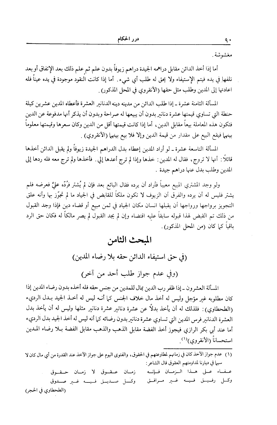 الْمَبْحَثُ الثَّامِنُ (فِي حَقِّ اسْتِيفَاءِ الدَّائِنِ حَقَّهُ بِلَا رِضَاءِ الْمَدِينِ) (وَفِي عَدَمِ جَوَازِ طَلَبِ أَحَدٍ مِنْ آخَرَ) الْمَسْأَلَةُ الْعِشْرُونَ - إذَا ظَفَرَ رَبُّ الدَّيْنِ بِمَالٍ لِلْمَدِينِ مِنْ جِنْسِ حَقِّهِ فَلَهُ أَخْذُهُ بِدُونِ رِضَاءِ الْمَدِينِ إذَا كَانَ مَطْلُوبُهُ غَيْرَ مُؤَجَّلٍ وَلَيْسَ لَهُ أَخْذُ مَالٍ خِلَافَ الْجِنْسِ كَمَا أَنَّهُ لَيْسَ لَهُ أَخْذُ الْجَيِّدِ بَدَلَ الرَّدِيءِ (الطَّحْطَاوِيُّ) : فَلِذَلِكَ لَهُ أَنْ يَأْخُذَ بَدَلًا عَنْ عَشَرَةِ دَنَانِيرَ عَشْرَةَ دَنَانِيرَ مِثْلَهَا، وَلَيْسَ لَهُ أَنْ يَأْخُذَ بَدَلَ الْعَشَرَةِ الدَّنَانِيرِ فَرَسَ الْمَدِينِ الَّتِي تُسَاوِي عَشَرَةَ دَنَانِيرَ بِدُونِ رِضَائِهِ كَمَا أَنَّهُ لَيْسَ لَهُ أَخْذُ الْجَيِّدِ بَدَلَ الرَّدِيءِ أَمَّا عِنْدَ أَبِي بَكْرٍ الرَّازِيّ فَيَجُوزُ أَخْذُ الْفِضَّةِ مُقَابِلَ الذَّهَبِ، وَالذَّهَبِ مُقَابِلَ الْفِضَّةِ بِلَا رِضَاءِ الْمَدِينِ اسْتِحْسَانًا (الْأَنْقِرْوِيُّ) .