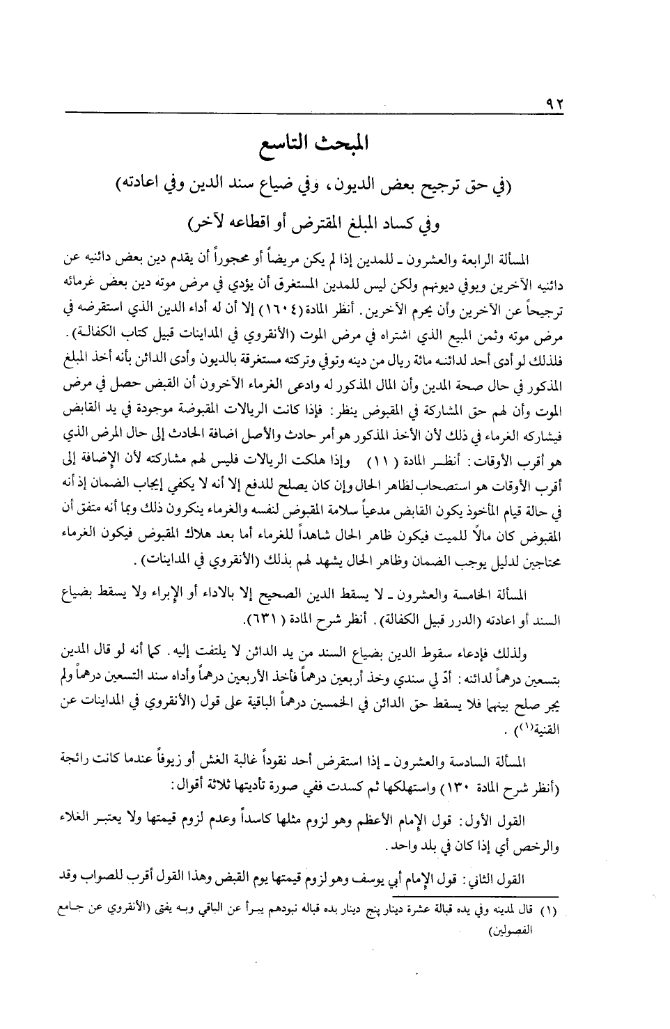 الْمَبْحَثُ التَّاسِعُ (فِي حَقِّ تَرْجِيحِ بَعْضِ الدُّيُونِ، وَفِي ضَيَاعِ سَنَدِ الدَّيْنِ وَفِي إعَادَتِهِ) وَفِي كَسَادِ الْمَبْلَغِ الْمُقْتَرَضِ أَوْ إقْطَاعِهِ لِآخَرَ) . الْمَسْأَلَةُ الرَّابِعَةُ وَالْعِشْرُونَ - لِلْمَدِينِ إذَا لَمْ يَكُنْ مَرِيضًا أَوْ مَحْجُورًا أَنْ يُقَدِّمَ دَيْنَ بَعْضِ دَائِنِيهِ عَنْ دَائِنِيهِ الْآخَرِينَ، وَيُوَفِّيَ دُيُونَهُمْ وَلَكِنْ لَيْسَ لِلْمَدِينِ الْمُسْتَغْرِقِ أَنْ يُؤَدِّيَ فِي مَرَضِ مَوْتِهِ دَيْنَ بَعْضِ غُرَمَائِهِ تَرْجِيحًا عَنْ الْآخَرِينَ وَأَنْ يَحْرِمَ الْآخَرِينَ. اُنْظُرْ الْمَادَّةَ (4 0 6 1) إلَّا أَنَّ لَهُ أَدَاءَ الدَّيْنِ الَّذِي اسْتَقْرَضَهُ فِي مَرَضِ مَوْتِهِ، وَثَمَنَ الْمَبِيعِ الَّذِي اشْتَرَاهُ فِي مَرَضِ الْمَوْتِ (الْأَنْقِرْوِيُّ فِي الْمُدَايَنَاتِ قُبَيْلَ كِتَابِ الْكَفَالَةِ) ، فَلِذَلِكَ لَوْ أَدَّى أَحَدٌ لِدَائِنِهِ مِائَةَ رِيَالٍ مِنْ دَيْنِهِ وَتُوُفِّيَ وَتَرِكَتُهُ مُسْتَغْرَقَةٌ بِالدُّيُونِ وَأَدَّى الدَّائِنُ بِأَنَّهُ أَخَذَ الْمَبْلَغَ الْمَذْكُورَ فِي حَالِ صِحَّةِ الْمَدِينِ وَأَنَّ الْمَالَ الْمَذْكُورَ لَهُ وَادَّعَى الْغُرَمَاءُ الْآخَرُونَ أَنَّ الْقَبْضَ حَصَلَ فِي مَرَضِ الْمَوْتِ وَأَنَّ لَهُمْ حَقَّ الْمُشَارَكَةِ فِي الْمَقْبُوضِ يُنْظَرُ: فَإِذَا كَانَتْ الرِّيَالَاتُ الْمَقْبُوضَةُ مَوْجُودَةً فِي يَدِ الْقَابِضِ فَيُشَارِكُهُ الْغُرَمَاءُ فِي ذَلِكَ لِأَنَّ الْأَخْذَ الْمَذْكُورَ هُوَ أَمْرٌ حَادِثٌ وَالْأَصْلُ إضَافَةُ الْحَادِثِ إلَى حَالِ الْمَرَضِ الَّذِي هُوَ أَقْرَبُ الْأَوْقَاتِ: اُنْظُرْ الْمَادَّةَ (1 1) وَإِذَا هَلَكَتْ الرِّيَالَاتُ فَلَيْسَ لَهُمْ مُشَارَكَتُهُ لِأَنَّ الْإِضَافَةَ إلَى أَقْرَبِ الْأَوْقَاتِ هُوَ اسْتِصْحَابٌ لِظَاهِرِ الْحَالِ وَإِنْ كَانَ يَصْلُحُ لِلدَّفْعِ إلَّا أَنَّهُ لَا يَكْفِي إيجَابُ الضَّمَانِ إذْ أَنَّهُ فِي حَالَةِ قِيَامِ الْمَأْخُوذِ يَكُونُ الْقَابِضُ مُدَّعِيًا سَلَامَةَ الْمَقْبُوضِ لِنَفْسِهِ، وَالْغُرَمَاءُ يُنْكِرُونَ ذَلِكَ وَبِمَا أَنَّهُ مُتَّفَقٌ أَنَّ الْمَقْبُوضَ كَانَ مَالًا لِلْمَيِّتِ فَيَكُونُ ظَاهِرُ الْحَالِ شَاهِدًا لِلْغُرَمَاءِ أَمَّا بَعْدَ هَلَاكِ الْمَقْبُوضِ فَيَكُونُ الْغُرَمَاءُ مُحْتَاجِينَ لِدَلِيلٍ يُوجِبُ الضَّمَانَ، وَظَاهِرُ الْحَالِ يَشْهَدُ لَهُمْ بِذَلِكَ (الْأَنْقِرْوِيُّ فِي الْمُدَايَنَاتِ) .