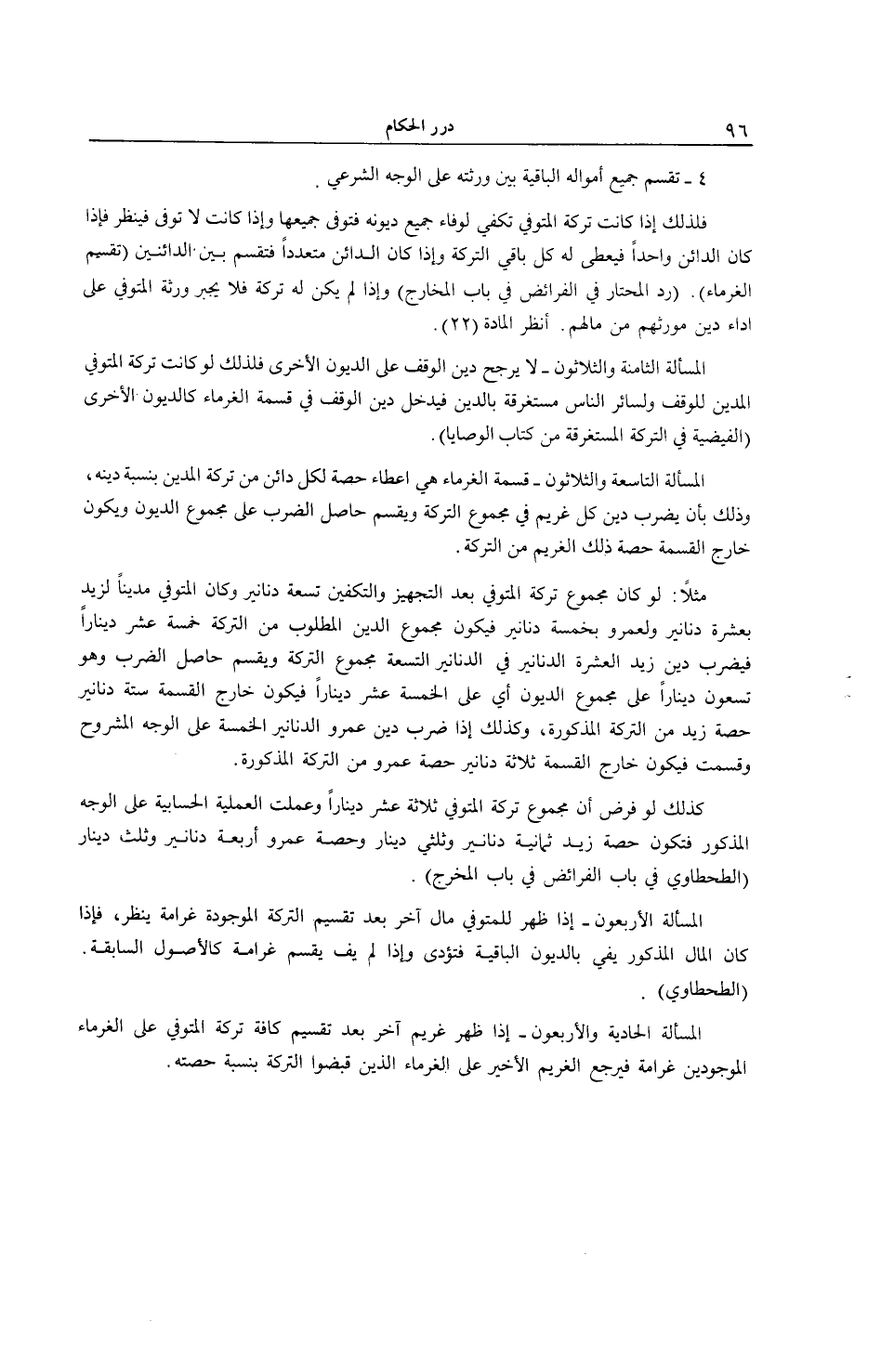 فَلِذَلِكَ إذَا كَانَتْ تَرِكَةُ الْمُتَوَفَّى تَكْفِي لِوَفَاءِ جَمِيعِ دُيُونِهِ فَتُوَفَّى جَمِيعُهَا وَإِذَا كَانَتْ لَا تُوفِي فَيُنْظَرُ فَإِذَا كَانَ الدَّائِنُ وَاحِدًا فَيُعْطَى لَهُ كُلُّ بَاقِي التَّرِكَةِ وَإِذَا كَانَ الدَّائِنُ مُتَعَدِّدًا فَتُقَسَّمُ بَيْنَ الدَّائِنِينَ (تَقْسِيمَ الْغُرَمَاءِ) . (رَدُّ الْمُحْتَارِ فِي الْفَرَائِضِ فِي بَابِ الْمَخَارِجِ) وَإِذَا لَمْ يَكُنْ لَهُ تَرِكَةٌ فَلَا يُجْبَرُ وَرَثَةُ الْمُتَوَفَّى عَلَى أَدَاءِ دَيْنِ مُوَرِّثِهِمْ مِنْ مَالِهِمْ. اُنْظُرْ الْمَادَّةَ (22) .