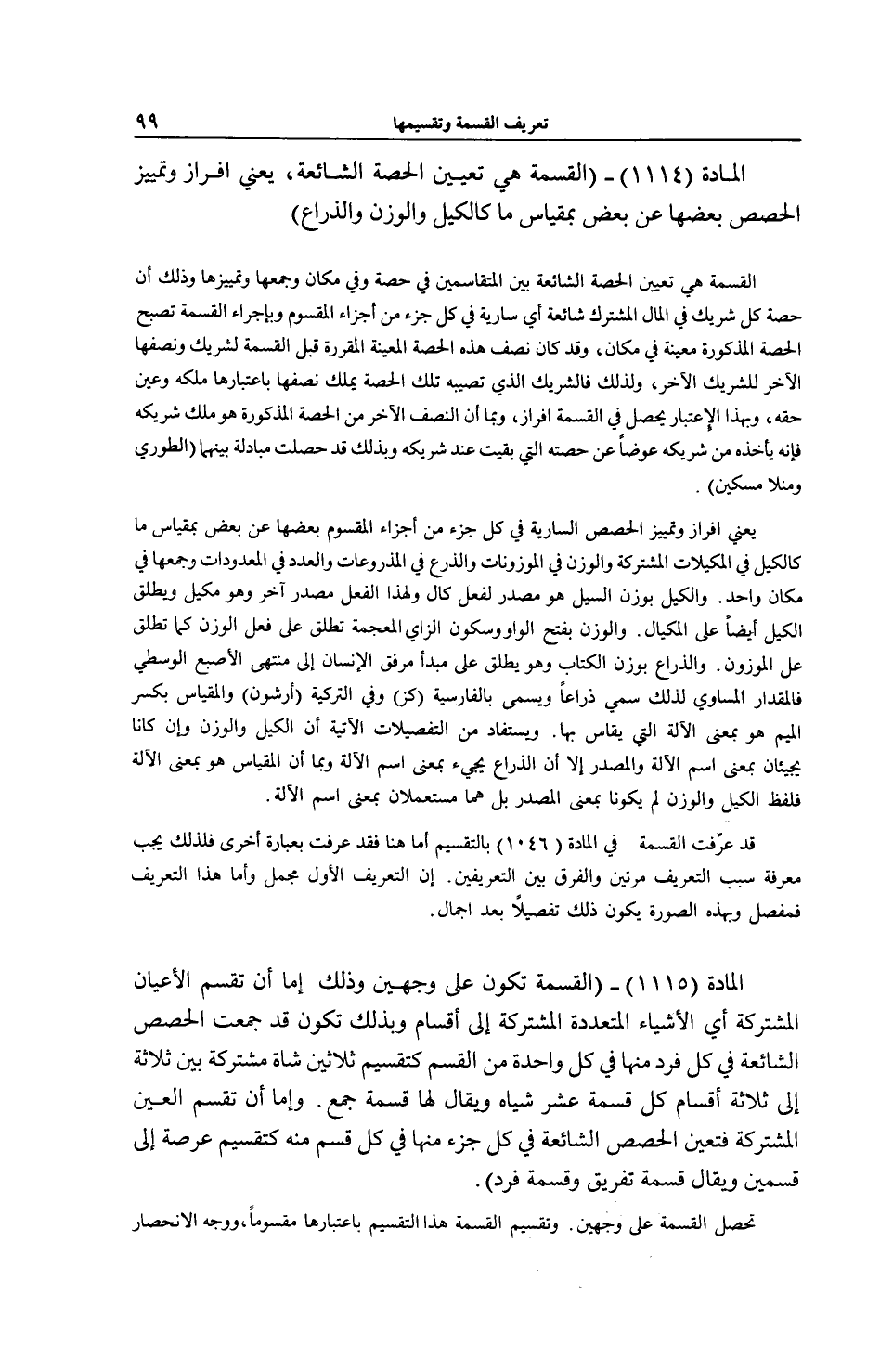 الْمَادَّةُ (1114) - (الْقِسْمَةُ هِيَ تَعْيِينُ الْحِصَّةِ الشَّائِعَةِ، يَعْنِي إفْرَازُ وَتَمْيِيزُ الْحِصَصِ بَعْضِهَا عَنْ بَعْضٍ بِمِقْيَاسٍ مَا كَالْكَيْلِ وَالْوَزْنِ وَالذِّرَاعِ) الْقِسْمَةُ هِيَ تَعْيِينُ الْحِصَّةِ الشَّائِعَةِ بَيْنَ الْمُتَقَاسِمَيْنِ فِي حِصَّةٍ وَفِي مَكَان وَجَمْعُهَا وَتَمْيِيزُهَا وَذَلِكَ أَنَّ حِصَّةَ كُلِّ شَرِيكٍ فِي الْمَالِ الْمُشْتَرَكِ شَائِعَةٌ أَيْ سَارِيَةٌ فِي كُلِّ جُزْءٍ مِنْ أَجْزَاءِ الْمَقْسُومِ وَبِإِجْرَاءِ الْقِسْمَةِ تُصْبِحُ الْحِصَّةُ الْمَذْكُورَةُ مُعَيَّنَةً فِي مَكَان، وَقَدْ كَانَ نِصْفُ هَذِهِ الْحِصَّةِ الْمُعَيَّنَةِ الْمُقَرَّرَةِ قَبْلَ الْقِسْمَةِ لِشَرِيكٍ وَنِصْفُهَا الْآخَرُ لِلشَّرِيكِ الْآخَرِ، وَلِذَلِكَ فَالشَّرِيكُ الَّذِي تُصِيبُهُ تِلْكَ الْحِصَّةُ يَمْلِكُ نِصْفَهَا بِاعْتِبَارِهَا مِلْكَهُ وَعَيْنَ حَقِّهِ، وَبِهَذَا الِاعْتِبَارِ يَحْصُلُ فِي الْقِسْمَةِ إفْرَازٌ، وَبِمَا أَنَّ النِّصْفَ الْآخَرَ مِنْ الْحِصَّةِ الْمَذْكُورَةِ هُوَ مِلْكُ شَرِيكِهِ فَإِنَّهُ يَأْخُذُهُ مِنْ شَرِيكِهِ عِوَضًا عَنْ حِصَّتِهِ الَّتِي بَقِيَتْ عِنْدَ شَرِيكِهِ وَبِذَلِكَ قَدْ حَصَلَتْ مُبَادَلَةٌ بَيْنَهُمَا (الطُّورِيُّ وَمُنْلَا مِسْكِينٍ) .