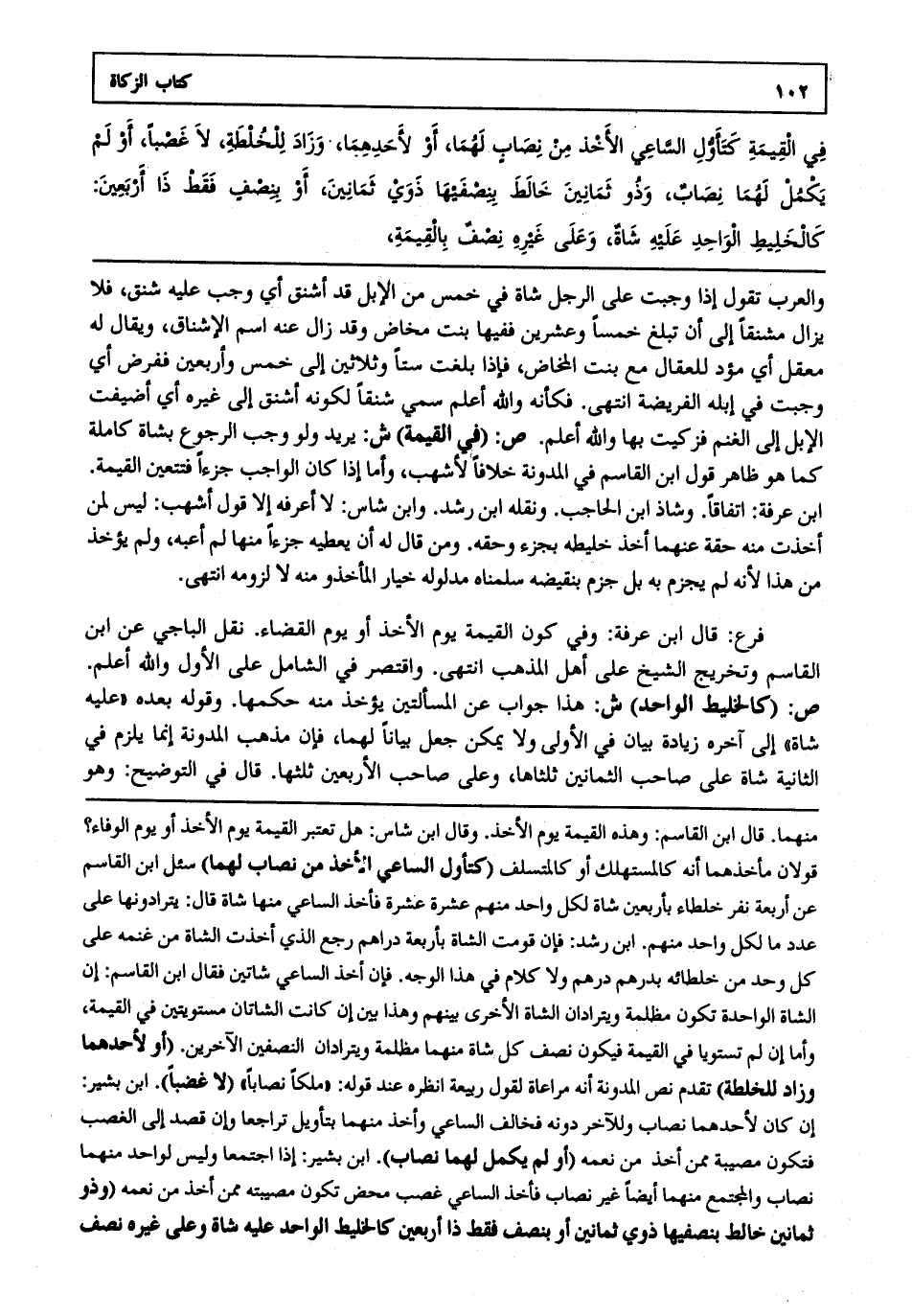 والعرب تقول إذا وجبت على الرجل شاة في خمس من الإبل قد أشنق أي وجب عليه شنق فلا يزال مشنقا إلى أن تبلغ خمسا وعشرين ففيها بنت مخاض وقد زال عنه اسم الإشناق ويقال له معقل أي مؤد للعقال مع بنت المخاض فإذا بلغت ستا وثلاثين إلى خمس وأربعين ففرض أي وجبت في إبله الفريضة انتهى. فكأنه والله أعلم. سمي شنقا لكونه أشنق إلى غيره أي أضيفت الإبل إلى الغنم فزكيت بها والله أعلم. ص: "في القيمة". ش: يريد ولو وجب الرجوع بشاة كاملة كما هو ظاهر قول ابن القاسم في المدونة خلافا لأشهب وأما إذا كان الواجب جزءا فتتعين القيمة ابن عرفة اتفاقا وشاذ ابن الحاجب ونقله ابن رشد وابن شاس لا أعرفه إلا قول أشهب ليس لمن أخذت منه حقة عنهما أخذ خليطه بجزء وحقه ومن قال له أن يعطيه جزءا منها لم أعبه ولم يؤخذ من هذا لأنه لم يجزم به بل جزم بنقيضه سلمناه مدلوله خيار المأخذ ومنه لا لزومه انتهى.