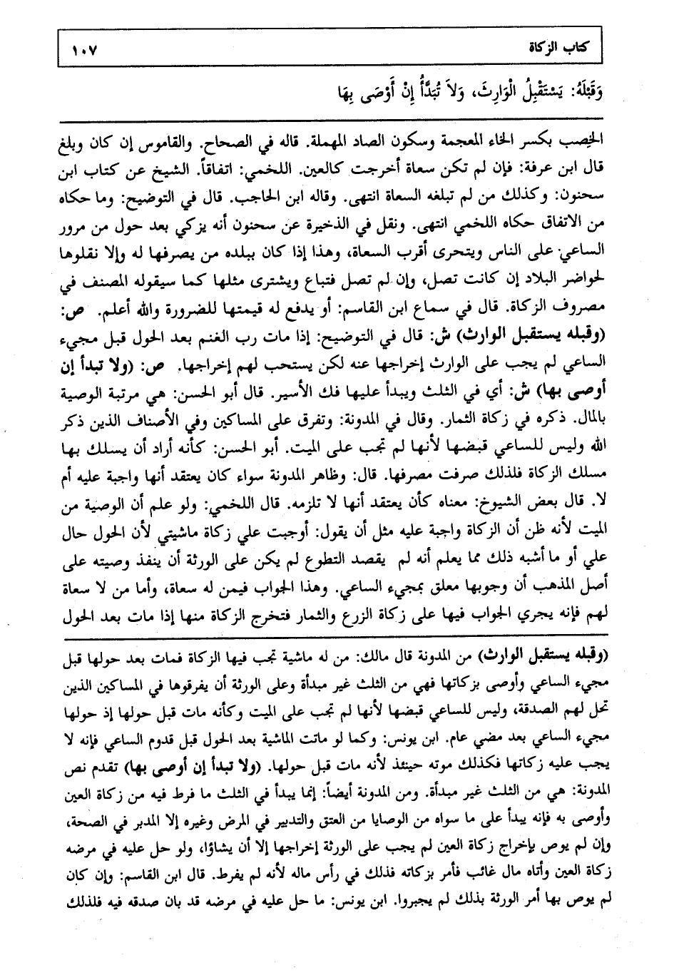 الخصب بكسر الخاء المعجمة وسكون الصاد المهملة قاله في الصحاح والقاموس إن كان وبلغ قال ابن عرفة: فإن لم تكن سعاة أخرجت كالعين اللخمي اتفاقا الشيخ عن كتاب ابن سحنون وكذلك من لم تبلغه السعاة انتهى. وقاله ابن الحاجب قال في التوضيح: وما حكاه من الاتفاق حكاه اللخمي انتهى. ونقل في الذخيرة عن سحنون أنه يزكي بعد حول من مرور الساعي على الناس ويتحرى أقرب السعاة وهذا إذا كان ببلده من يصرفها له وإلا نقلوها لحواضر البلاد إن كانت تصل وإن لم تصل فتباع ويشترى مثلها كما سيقوله المصنف في مصروف الزكاة قال في سماع ابن القاسم أو يدفع له قيمتها للضرورة والله أعلم. ص: "وقبله يستقبل الوارث". ش: قال في التوضيح: إذا مات رب الغنم بعد الحول قبل مجيء الساعي لم يجب على الوارث إخراجها عنه لكن يستحب لهم إخراجها. ص: "ولا تبدأ إن أوصى بها". ش: أي في الثلث ويبدأ عليها فك الأسير قال أبو الحسن: هي مرتبة الوصية بالمال ذكره في زكاة الثمار وقال في المدونة وتفرق على المساكين وفي الأصناف الذين ذكر الله وليس للساعي قبضها لأنها لم تجب على الميت أبو الحسن كأنه أراد أن يسلك بها مسلك الزكاة فلذلك صرفت مصرفها قال وظاهر المدونة سواء كان يعتقد أنها واجبة عليه أم لا قال بعض الشيوخ معناه كأن يعتقد أنها لا تلزمه قال اللخمي: ولو علم أن الوصية من الميت لأنه ظن أن الزكاة واجبة عليه مثل أن يقول أوجبت علي زكاة ماشيتي لأن الحول حال علي أو ما أشبه ذلك مما يعلم أنه لم يقصد التطوع لم يكن على الورثة أن ينفذ وصيته على أصل المذهب أن وجوبها معلق بمجيء الساعي وهذا الجواب فيمن له سعاة وأما من لا سعاة لهم فإنه يجري الجواب فيها على زكاة الزرع والثمار فتخرج الزكاة منها إذا مات بعد الحول