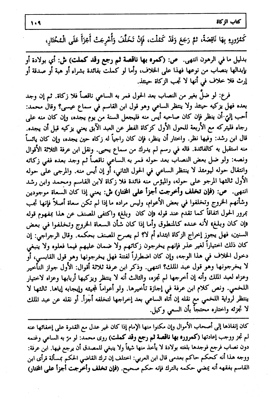 بدليل ما في الرهون انتهى. ص: "كمره بها ناقصة ثم رجع وقد كملت". ش: أي بولادة أو بإبدالها بنصاب من نوعها فهذا على الخلاف وأما لو كملت بفائدة بشراء أو هبة أو صدقة أو إرث فلا خلاف في أنها لا تجب الزكاة حينئذ.