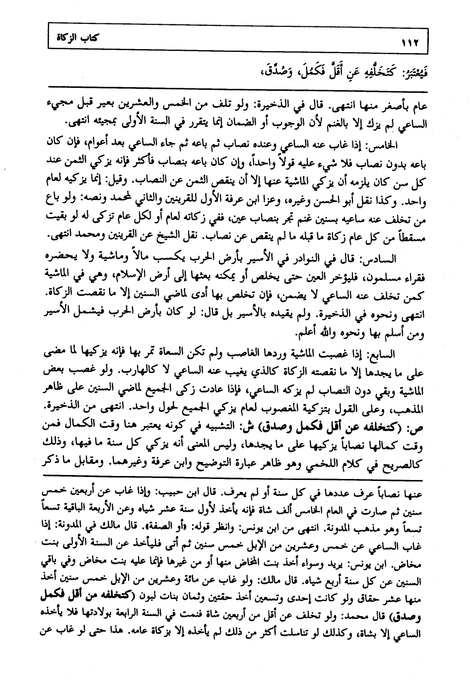 السابع: إذا غصبت الماشية وردها الغاصب ولم تكن السعاة تمر بها فإنه يزكيها لما مضى على ما يجدها إلا ما نقصته الزكاة كالذي يغيب عنه الساعي لا كالهارب ولو غصب بعض الماشية وبقي دون النصاب لم يزكه الساعي فإذا عادت زكى الجميع لماضي السنين على ظاهر المذهب وعلى القول بتزكية المغصوب لعام يزكي الجميع لحول واحد انتهى. من الذخيرة. ص: "كتخلفه عن أقل فكمل وصدق". ش: التشبيه في كونه يعتبر هنا وقت الكمال فمن وقت كمالها نصاباً يزكيها على ما يجدها وليس المعنى أنه يزكي كل سنة ما فيها وذلك كالصريح في كلام اللخمي وهو ظاهر عبارة التوضيح وابن عرفة وغيرهما ومقابل ما ذكر
