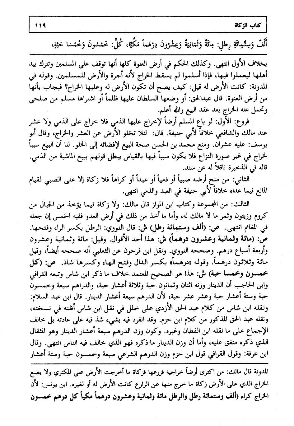 الثالث: من المجموعة وكتاب ابن المواز قال مالك: ولا زكاة فيما يؤخذ من الجبال من كروم وزيتون وثمر ما لا مالك له وأما ما أخذ من ذلك في أرض العدو ففيه الخمس إن جعله في المغانم انتهى. ص: "ألف وستمائة رطل". ش: قال النووي: الرطل بكسر الراء وفتحها. ص: "مائة وثمانية وعشرون درهما". ش: هذا أحد الأقوال وقيل مائة وثمانية وعشرون وأربعة أسباع درهم وصححه النووي ونقل ابن فرحون عن الثعلبي أنه صححه أيضا وقيل مائة وثلاثون درهما وقوله درهما بكسر الدال وفتح الهاء وكسرها شاذ. ص: "كل خمسون وخمسا حبة". ش: هذا هو الصحيح المعتمد خلاف ما ذكر ابن شاس وتبعه القرافي وابن الحاجب أن الدينار وزنه اثنان وثمانون حبة وثلاثة أعشار حبة والدراهم سبعة وخمسون حبة وستة أعشار حبة وعشر عشر حبة لأن الدرهم سبعة أعشار الدينار قال ابن عبد السلام: ونقله ابن شاس من كلام عبد الحق الأزدي على خلل في نقل ابن شاس أظنه في نسخته ونقله عبد الحق المذكور من كلام ابن حزم وقد انفرد فيه بشيء شذ فيه على عادته بل خالف الإجماع على ما نقله ابن القطان وغيره وكون وزن الدرهم سبعة أعشار الدينار وهو المثقال الذي ذكره متفق عليه وأما أن وزن الدينار ما ذكره فهو الذي خالف فيه الناس انتهى. وقال ابن عرفة: وقول القرافي: قول ابن حزم وزن الدرهم الشرعي سبعة وخمسون حبة وستة أعشار