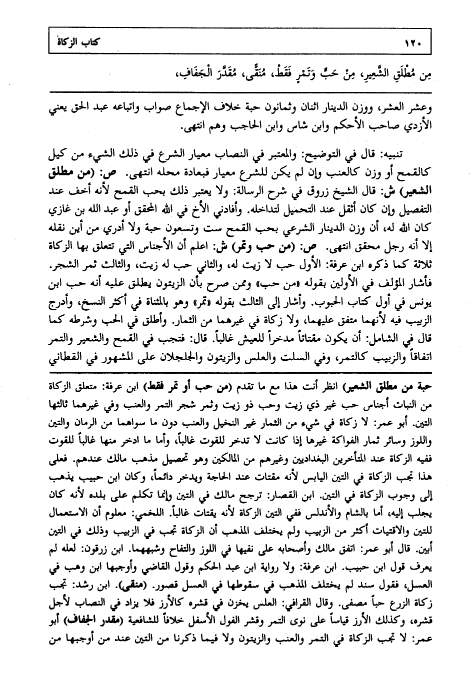 تنبيه: قال في التوضيح: والمعتبر في النصاب معيار الشرع في ذلك الشيء من كيل كالقمح أو وزن كالعنب وإن لم يكن للشرع معيار فبعادة محله انتهى. ص: "من مطلق الشعير". ش: قال الشيخ زروق في شرح الرسالة ولا يعتبر ذلك بحب القمح لأنه أخف عند التفصيل وإن كان أثقل عند التحميل لتداخله وأفادني الأخ في الله المحقق أبوعبد الله بن غازي كان الله له أن وزن الدينار الشرعي بحب القمح ست وتسعون حبة ولا أدري من أين نقله إلا أنه رجل محقق انتهى. ص: "من حب وتمر". ش: اعلم أن الأجناس التي تتعلق بها الزكاة ثلاثة كما ذكره ابن عرفة الأول حب لا زيت له والثاني حب له زيت والثالث ثمر الشجر فأشار المؤلف في الأولين بقوله من حب وممن صرح بأن الزيتون يطلق عليه أنه حب ابن يونس في أول كتاب الحبوب وأشار إلى الثالث بقوله تمر وهو بالمثناة في أكثر النسخ وأدرج الزبيب فيه لأنهما متفق عليهما ولا زكاة في غيرهما من الثمار وأطلق في الحب وشرطه كما قال في الشامل: أن يكون مقتاتا مدخرا للعيش غالبا قال فتجب في القمح والشعير والتمر اتفاقا والزبيب كالتمر وفي السلت والعلس والزيتون والجلجلان على المشهور في القطاني