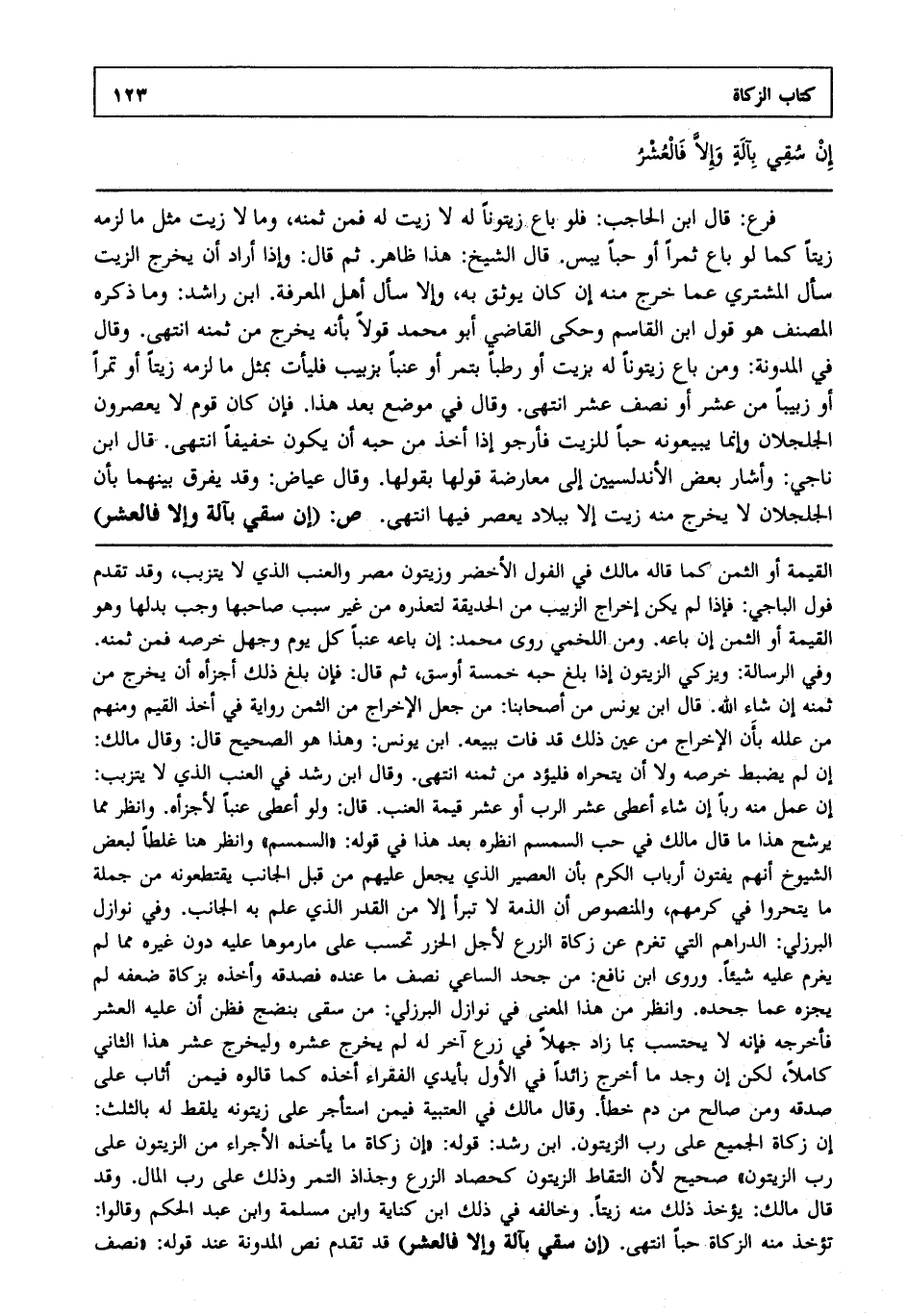 فرع: قال ابن الحاجب: فلو باع زيتونا له لا زيت له فمن ثمنه وما لا زيت مثل ما لزمه زيتا كما لو باع ثمرا أو حبا يبس قال الشيخ هذا ظاهر ثم قال وإذا أراد أن يخرج الزيت سأل المشتري عما خرج منه إن كان يوثق به وإلا سأل أهل المعرفة ابن راشد وما ذكره المصنف هو قول ابن القاسم وحكى القاضي أبو محمد قولا بأنه يخرج من ثمنه انتهى. وقال في المدونة ومن باع زيتونا له بزيت أو رطبا بتمر أو عنبا بزبيب فليأت بمثل ما لزمه زيتا أو تمرا أو زبيبا من عشر أو نصف عشر انتهى. وقال في موضع بعد هذا فإن كان قوم لا يعصرون الجلجلان وإنما يبيعونه حبا للزيت فأرجو إذا أخذ من حبه أن يكون خفيفا انتهى. قال ابن ناجي وأشار بعض الأندلسيين إلى معارضة قولها بقولها وقال عياض وقد يفرق بينهما بأن الجلجلان لا يخرج منه زيت إلا ببلاد يعصر فيها انتهى. ص: "إن سقي بآلة وإلا فالعشر