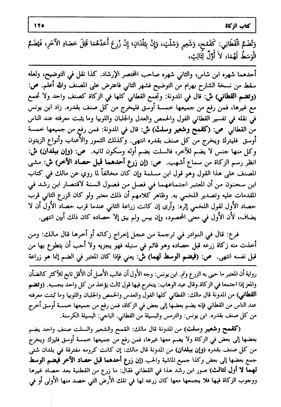 أحدهما شهره ابن شاس والثاني شهره صاحب المختصر الإرشاد كذا نقل في التوضيح ولعله سقط من نسخة الشارح بهرام من التوضيح فشهر الثاني فاعترض على المصنف والله أعلم. ص: "وتضم القطاني". ش: قال في المدونة وتجمع القطاني كلها في الزكاة كصنف واحد ولا تجمع مع غيرها فمن رفع من جميعها خمسة أوسق فليخرج من كل صنف بقدره زاد ابن يونس في نقله في تفسير القطاني الفول والحمص والعدل والجلبان واللوبيا وما يثبت معرفته عند الناس من القطاني. ص: "كقمح وشعير وسلت". ش: قال في المدونة فمن رفع من جميعها خمسة أوسق فليترك ويخرج من كل صنف بقدره انتهى. وكذلك الثمور والأعناب وأنواع الزيتون وكل منها جنس لا يضم للآخر فالسلت بضم أوله وسكون ثانيه. ص: "وإن ببلدان". ش: انظر رسم الزكاة من سماع أشهب. ص: "إن زرع أحدهما قبل حصاد الآخر". ش: مشى المصنف على هذا القول وهو قول ابن مسلمة وإن كان مخالفا لما روي عن مالك في كتاب ابن سحنون من أن المعتبر اجتماعهما في فصل:من فصول السنة لاقتصار ابن رشد في المقدمات عليه وتصدير اللخمي به وظاهر كلامهم أن ذلك معتبر ولو كان الزرع الثاني قرب حصاد الأول لقول اللخمي إثره وأرى إن كانت زراعة الثاني عندما قرب حصاد الأول أن لا يضاف لأن الأول في معنى المحصود وإن يبس ولم يبق إلا حصاده كان ذلك أبين انتهى.