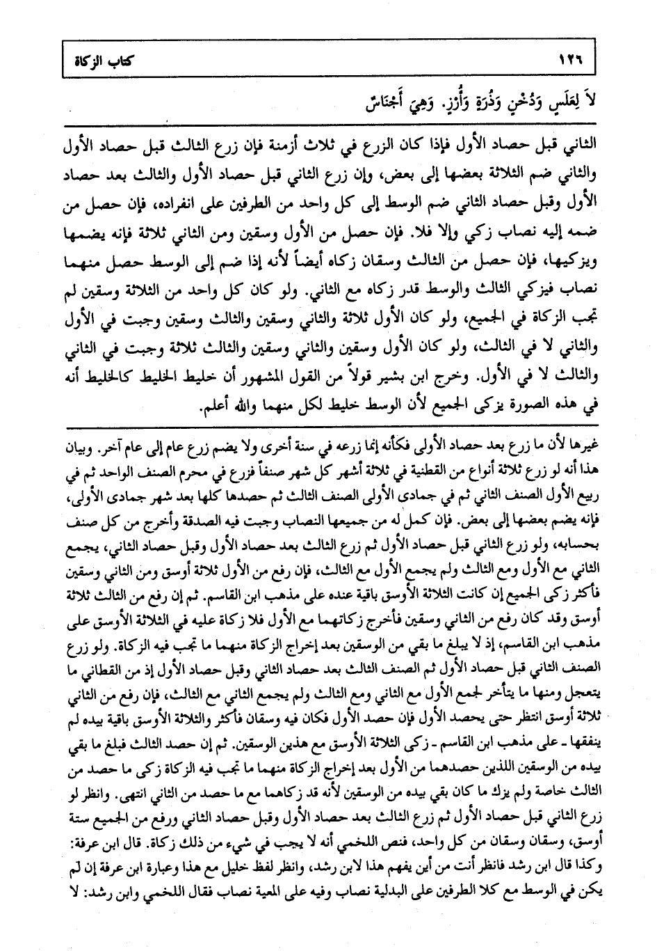 الثاني قبل حصاد الأول فإذا كان الزرع في ثلاث أزمنة فإن زرع الثالث قبل حصاد الأول والثاني ضم الثلاثة بعضها إلى بعض وإن زرع الثاني قبل حصاد الأول والثالث بعد حصاد الأول وقبل حصاد الثاني ضم الوسط إلى كل واحد من الطرفين على انفراده فإن حصل من ضمه إليه نصاب زكي وإلا فلا فإن حصل من الأول وسقين ومن الثاني ثلاثة فإنه يضمها ويزكيها فإن حصل من الثالث وسقان زكاه أيضا لأنه إذا ضم إلى الوسط حصل منهما نصاب فيزكي الثالث والوسط قدر زكاه مع الثاني ولو كان كل واحد من الثلاثة وسقين لم تجب الزكاة في الجميع ولو كان الأول ثلاثة والثاني وسقين والثالث وسقين وجبت في الأول والثاني لا في الثالث ولو كان الأول وسقين والثاني وسقين والثالث ثلاثة وجبت في الثاني والثالث لا في الأول وخرج ابن بشير قولا من القول المشهور أن خليط الخليط كالخليط أنه في هذه الصورة يزكى الجميع لأن الوسط خليط لكل منهما والله أعلم.