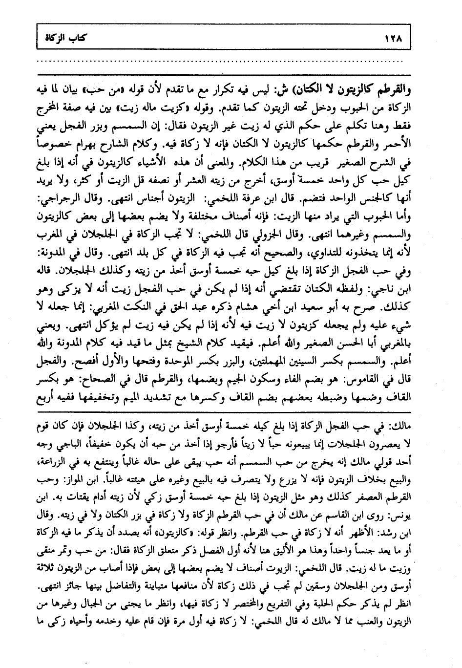 والقرطم كالزيتون لا الكتان". ش: ليس فيه تكرار مع ما تقدم لأن قوله: من حب بيان لما فيه الزكاة من الحبوب ودخل تحته الزيتون كما تقدم وقوله كزيت ماله زيت بين فيه صفة المخرج فقط وهنا تكلم على حكم الذي له زيت غير الزيتون فقال إن السمسم وبزر الفجل يعني الأحمر والقرطم حكمها كالزيتون لا الكتان فإنه لا زكاة فيه وكلام الشارح بهرام خصوصا في الشرح الصغير قريب من هذا الكلام والمعنى أن هذه الأشياء كالزيتون في أنه إذا بلغ كيل حب كل واحد خمسة أوسق أخرج من زيته العشر أو نصفه قل الزيت أو كثر ولا يريد أنها كالجنس الواحد فتضم قال ابن عرفة: اللخمي الزيتون أجناس انتهى. وقال الرجراجي وأما الحبوب التي يراد منها الزيت فإنه أصناف مختلفة ولا يضم بعضها إلى بعض كالزيتون والسمسم وغيرهما انتهى. وقال الجزولي قال اللخمي: لا تجب الزكاة في الجلجلان في المغرب لأنه إنما يتخذونه للتداوي والصحيح أنه تجب فيه الزكاة في كل بلد انتهى. وقال في المدونة وفي حب الفجل الزكاة إذا بلغ كيل حبه خمسة أوسق أخذ من زيته وكذلك الجلجلان قاله ابن ناجي ولفظة الكتان تقتضي أنه إذا لم يكن في حب الفجل زيت أنه لا يزكى وهو كذلك صرح به أبو سعيد ابن أخي هشام ذكره عبد الحق في النكت المغربي إنما جعله لا شيء عليه ولم يجعله كزيتون لا زيت فيه لأنه إذا لم يكن فيه زيت لم يؤكل انتهى. ويعني بالمغربي أبا الحسن الصغير والله أعلم. فيقيد كلام الشيخ بمثل ما قيد فيه كلام المدونة والله أعلم. والسمسم بكسر السينين المهملتين والبزر بكسر الموحدة وفتحها والأول أفصح والفجل قال في القاموس هو بضم الفاء وسكون الجيم وبضمها والقرطم قال في الصحاح هو بكسر القاف وضمها وضبطه بعضهم بضم القاف وكسرها مع تشديد الميم وتخفيفها ففيه أربع