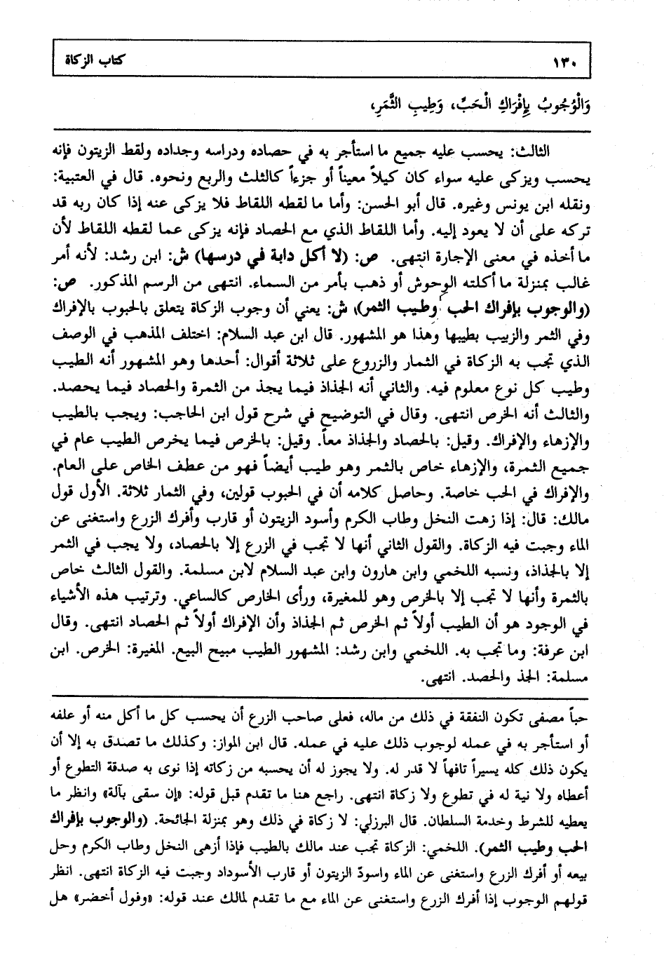 الثالث: يحسب عليه جميع ما استأجر به في حصاده ودراسه وجداده ولقط الزيتون فإنه يحسب ويزكى عليه سواء كان كيلا معينا أو جزءا كالثلث والربع ونحوه قا في العتبية: ونقله ابن يونس وغيره قال أبو الحسن: وأما ما لقطه اللقاط فلا يزكى عنه إذا كان ربه قد تركه على أن لا يعود إليه وأما اللقاط الذي مع الحصاد فإنه يزكى عما لقطه اللقاط لأن ما أخذه في معنى الإجارة انتهى. ص: "لا أكل دابة في درسها". ش: ابن رشد لأنه أمر غالب بمنزلة ما أكلته الوحوش أو ذهب بأمر من السماء انتهى. من الرسم المذكور. ص: "والوجوب بإفراك الحب أو طيب الثمر". ش: يعني أن وجوب الزكاة يتعلق بالحبوب بالإفراك وفي الثمر والزبيب بطيبها وهذا هو المشهور قال ابن عبد السلام: اختلف المذهب في الوصف الذي تجب به الزكاة في الثمار والزروع على ثلاثة أقوال أحدها وهو المشهور أنه الطيب وطيب كل نوع معلوم فيه والثاني أنه الجذاذ فيما يجذ من الثمرة والحصاد فيما يحصد والثالث أنه الخرص انتهى. و قال في التوضيح: في شرح قول ابن الحاجب ويجب بالطيب والإزهاء والإفراك وقيل بالحصاد والجذاذ معا وقيل بالخرص فيما يخرص الطيب عام في جميع الثمرة والإزهاء خاص بالثمر وهو طيب أيضا فهو من عطف الخاص على العام والإفراك في الحب خاصة فينبغي كلامه أن في الحبوب قولين وفي الثمار ثلاثة الأول قول مالك قال إذا زهت النخل وطاب الكرم وأسود الزيتون أو قارب وأفرك الزرع واستغنى عن الماء وجبت فيه الزكاة والقول الثاني أنها لا تجب في الزرع إلا بالحصاد ولا يجب في الثمر إلا بالجذاذ ونسبه اللخمي وابن هارون وابن عبد السلام لابن مسلمة والقول الثالث خاص بالثمرة وأنها لا تجب إلا بالخرص وهو للمغيرة ورأى الخارص كالساعي وترتيب هذه الأشياء في الوجود هو أن الطيب أولا عند الخرص عند الجذاذ وأن الإفراك أولا عند الحصاد انتهى. وقال ابن عرفة: وما تجب به اللخمي وابن رشد المشهور الطيب مبيح البيع المغيرة الخرص ابن مسلمة الجذ والحصد انتهى.