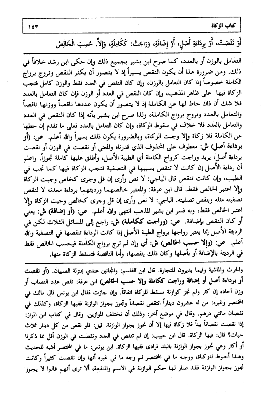 التعامل بالوزن أو بالعدد كما صرح ابن بشير بجميع ذلك وإن حكى ابن رشد خلافا في ذلك ومن ضرورة هذا أن يكون النقص يسيرا إذ لا يتصور أن يكثر النقص وتروج برواج الكاملة خصوصا إذا كان التعامل بالوزن وإن كان النقص في العدد فقط والوزن كامل فتجب الزكاة فيها على ظاهر المذهب وإن كان النقص في العدد أو الوزن فإن كان التعامل بالعدد فلا شك أن ذاك حاط لها عن الكاملة إذ لا يتصور أن يكون عددها ناقصا ووزنها ناقصا والتعامل بالعدد وتروج برواج الكاملة ولذا صرح ابن بشير بأنه إذا كان النقص في العدد والتعامل بالعدد فلا خلاف في سقوط الزكاة وإن كان التعامل بالعدد فعلى ما تقدم إن حطها عن الكاملة فلا زكاة وإلا وجبت الزكاة وبالضرورة يكون ذلك يسيرا والله أعلم. ص: "أو برداءة أصل". ش: معطوف على المحذوف الذي قدرناه والمعنى أو نقصت في الوزن أو نقصت برداءة أصل يريد وراجت كرواج الكاملة أي الطيبة الأصل وأطلق عليها كاملة تجوزا واعلم أن رداءة الأصل إن كانت لا تنقص بسببها في التصفية فتجب الزكاة فيها كما تجب في الطيب وإن كانت تنقص قال الباجي لا نص وأرى إن قل وجرى كخاص وجبت الزكاة وإلا اعتبر الخالص فقط قال ابن عرفة: والمعتبر خالصهما ورديئهما برداءة معدنه لا لنقص تصفيته مثله وبنقص تصفيته الباجي لا نص وأرى إن قل وجرى كخالص وجبت الزكاة وإلا اعتبر الخالص فقط ابن بشير المذهب انتهى. والله أعلم. ص: "أو إضافة". ش: يعني أو كان النقص بإضافة. ص: "وراجت ككاملة". ش: راجع إلى المسائل الثلاث لكن في الرديئة الأصل إنما يعتبر رواجها برواج الطيبة الأصل إذا كانت الرداءة تنقصها في التصفية والله أعلم. ص: "وإلا حسب الخالص". ش: أي وإن لم ترج برواج الكاملة فيحسب الخالص فقط في الرديئة بالإضافة أو بأصلها وكان ذلك ينقصها وأما الناقصة فتسقط الزكاة منها.