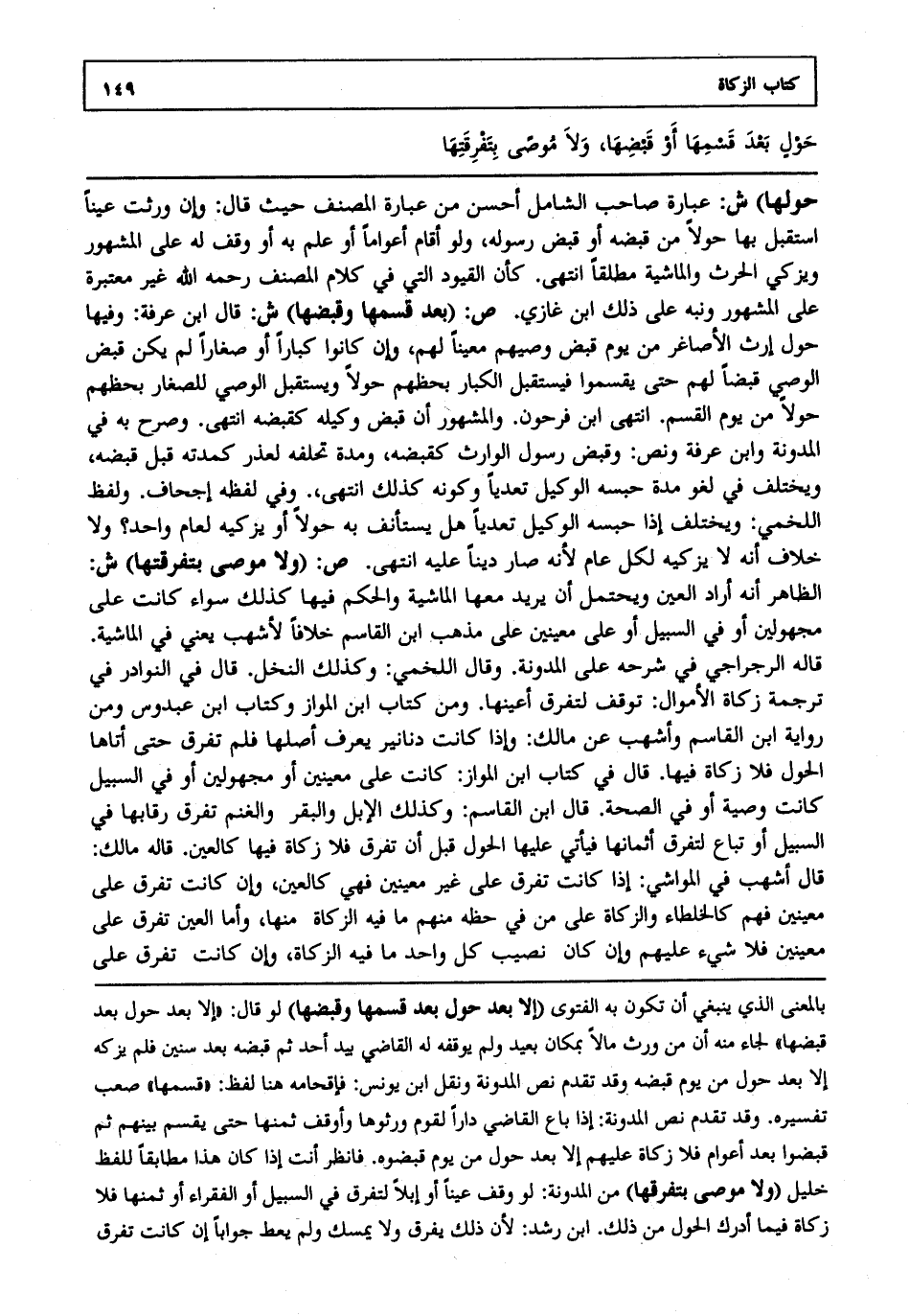 حولها". ش: عبارة صاحب الشامل أحسن من عبارة المصنف حيث قال وإن ورثت عينا استقبل بها حولا من قبضه أو قبض رسوله ولو أقام أعواما أو علم به أو وقف له على المشهور ويزكي الحرث والماشية مطلقا انتهى. كأن القيود التي في كلام المصنف رحمه الله غير معتبرة على المشهور ونبه على ذلك ابن غازي. ص: "بعد قسمها أو قبضها". ش: قال ابن عرفة: وفيها حول إرث الأصاغر من يوم قبض وصيهم معينا لهم وإن كانوا كبارا أو صغارا لم يكن قبض الوصي قبضا لهم حتى يقسموا فيستقبل الكبار بحظهم حولا ويستقبل الوصي للصغار بحظهم حولا من يوم القسم انتهى. ابن فرحون والمشهور أن قبض وكيله كقبضه انتهى. وصرح به في المدونة وابن عرفة ونص فأتى رسول الوارث كقبضه ومدة تحلفه لعذر كمدته قبل قبضه ويختلف في لغو مدة حبسه الوكيل تعديا وكونه كذلك انتهى. وفي لفظه إجحاف ولفظ اللخمي ويختلف إذا حبسه الوكيل تعديا هل يستأنف به حولا أو يزكيه لعام واحد ولا خلاف أنه لا يزكيه لكل عام لأنه صار دينا عليه انتهى. ص: "ولا موصى بتفرقتها". ش: الظاهر أنه أراد العين ويحتمل أن يريد معها الماشية والحكم فيها كذلك سواء كانت على مجهولين أو في السبيل أو على معينين على مذهب ابن القاسم خلافا لأشهب يعني في الماشية قاله الرجراجي في شرحه على المدونة و قال اللخمي: وكذلك النخل قال في النوادر في ترجمة زكاة الأموال توقف لتفرق أعينها ومن كتاب ابن المواز وكتاب ابن عبدوس ومن رواية ابن القاسم وأشهب عن مالك وإذا كانت دنانير يعرف أصلها فلم تفرق حتى أتاها الحول فلا زكاة فيها قال في كتاب ابن المواز كانت على معينين أو مجهولين أو في السبيل كانت وصية أو في الصحة قال ابن القاسم: وكذلك الإبل والبقر والغنم تفرق رقابها في السبيل أو تباع لتفرق أثمانها فيأتي عليها الحول قبل أن تفرق فلا زكاة فيها كالعين قاله مالك قال أشهب في المواشي: إذا كانت تفرق على غير معينين فهي كالعين وإن كانت تفرق على معينين فهم كالخلطاء والزكاة على من في حظه منهم ما فيه الزكاة منها وأما العين تفرق على معينين فلا شيء عليهم وإن كان نصيب كل واحد ما فيه الزكاة وإن كانت تفرق على