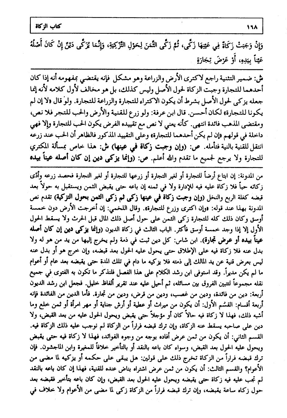 ش: ضمير التثنية راجع لاكترى الأرض والزراعة وهو مشكل فإنه يقتضي بمفهومه أنه إذا كان أحدهما للتجارة وجبت الزكاة لحول الأصل وليس كذلك بل هو مخالف لأول كلامه لأنه إنما جعله يزكى لحول الأصل بشرط أن يكون الاكتراء للتجارة والزراعة للتجارة ولو قال لا إن لم يكونا للتجارة لكان أحسن قال ابن عرفة: ولو زرع للقنية والأرض والحب للتجر فلا نص ومقتضى المذهب فائدة انتهى. كأنه يعني لا نص مع تقييده الفرض يكون الحب للتجارة وإلا فهي داخلة في قولهم إن لم يكن أحدهما للتجارة وعلى التقييد المذكور فالظاهر أن الحب عند زرعه انتقل للقنية بالنية فتأمله . ص: "وإن وجبت زكاة في عينها". ش: هذا خاص بمسألة المكتري للتجارة ولا يرجع لجميع ما تقدم والله أعلم. ص: "وإنما يزكى دين إن كان أصله عينا بيده