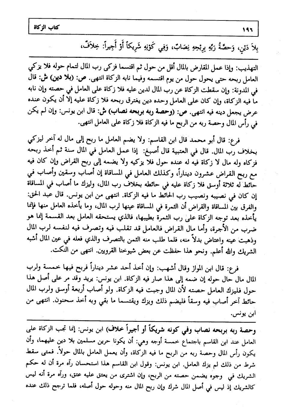 التهذيب وإذا عمل المقارض بالمال أقل من حول ثم اقتسما فزكى رب المال لتمام حوله فلا يزكي العامل ربحه حتى يحول حول من يوم اقتسمه وفيما نابه الزكاة انتهى. ص: "بلا دين". ش: قال في المدونة وإن سقطت الزكاة عن رب المال لدين عليه فلا زكاة على العامل في حصته وإن نابه ما فيه الزكاة وإن كان على العامل وحده دين يغترق ربحه فلا زكاة عليه إلا أن يكون عنده عرض يجعل دينه فيه انتهى. ص: "وحصة ربه بربحه نصاب". ش: قال ابن يونس: وإن لم يكن في رأس المال وحصة ربه من الربح ما فيه الزكاة فلا زكاة على العامل انتهى.