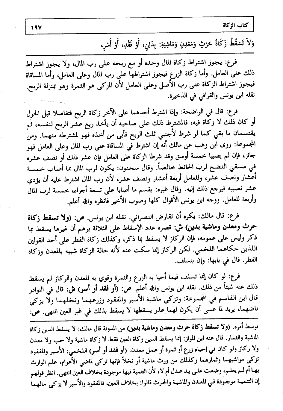 فرع يجوز اشتراط زكاة المال وحده أو مع ربحه على رب المال ولا يجوز اشتراط ذلك على العامل وأما زكاة الزرع فيجوز اشتراطها على رب المال وعلى العامل وأما المساقاة فيجوز اشتراط الزكاة على رب الأصل وعلى العامل لأن المزكى هو الثمرة وهو بمنزلة الربح نقله ابن يونس والقرافي في الذخيرة.