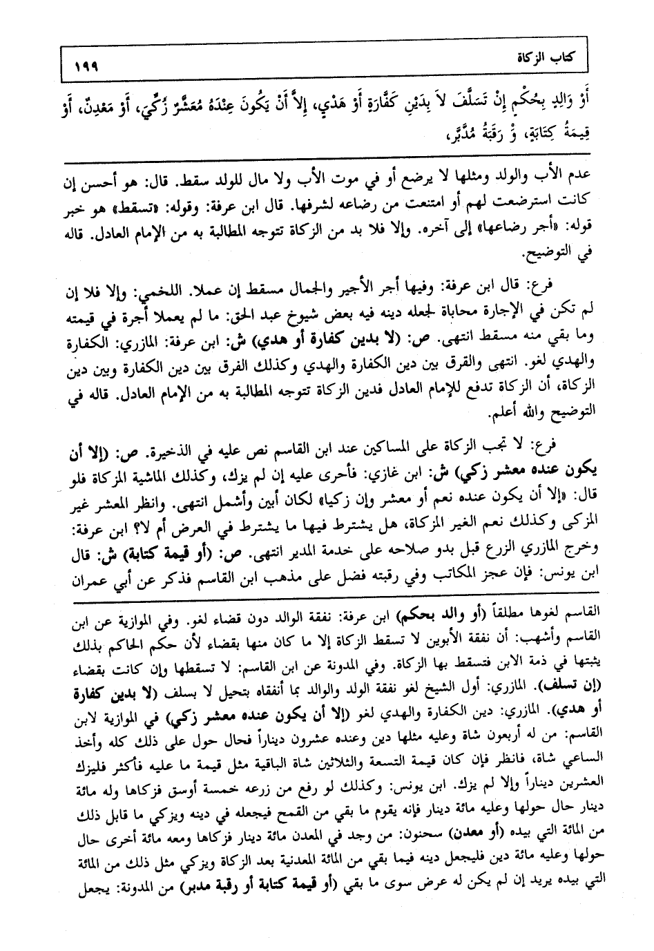 فرع: لا تجب الزكاة على المساكين عند ابن القاسم نص عليه في الذخيرة. ص: "إلا أن يكون عنده معشر زكي". ش: ابن غازي فأحرى عليه إن لم يزك وكذلك الماشية المزكاة فلو قال إلا أن يكون عنده نعم أو معشر وإن زكيا لكان أبين وأشمل انتهى. وانظر العشر غير المزكى وكذلك نعم الغير المزكاة هل يشترط فيها ما يشترط في العرض أم لا ابن عرفة وخرج المازري الزرع قبل بدو صلاحه على خدمة المدير انتهى. ص: "أو قيمة كتابة". ش: قال ابن يونس: فإن عجز المكاتب وفي رقبته فضل على مذهب ابن القاسم فذكر عن أبي عمران