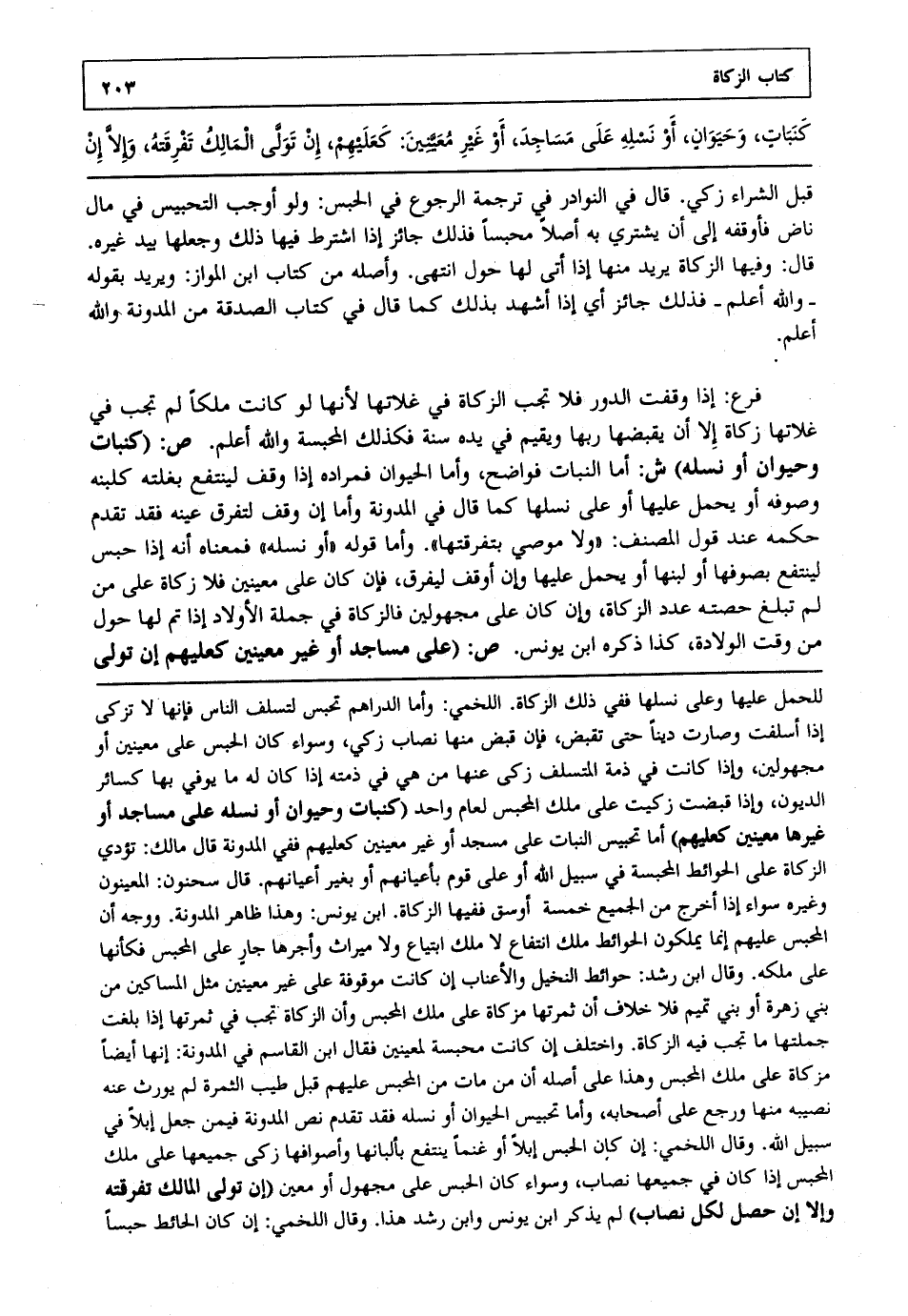 فرع: إذا وقفت الدور فلا تجب الزكاة في غلاتها لأنها لو كانت ملكا لم تجب في غلاتها زكاة إلا أن يقبضها ربها ويقيم في يده سنة فكذلك المحبسة والله أعلم. ص: "كنبات وحيوان أو نسله". ش: أما النبات فواضح وأما الحيوان فمراده إذا وقف لينتفع بغلته كلبنه وصوفه أو يحمل عليها أو على نسلها كما قال في المدونة وأما إن وقف لتفرق عينه فقد تقدم حكمه عند قول المصنف ولا موصي بتفرقتها وأما قوله: أو نسله فمعناه أنه إذا حبس لينتفع بصوفها أو لبنها أو يحمل عليها وإن أوقف ليفرق فإن كان على معينين فلا زكاة على من لم تبلغ حصته عدد الزكاة وإن كان على مجهولين فالزكاة في جملة الأولاد إذا تم لها حول من وقت الولادة كذا ذكره ابن يونس. ص: "على مساجد أوغير معينين كعليهم إن تولى
