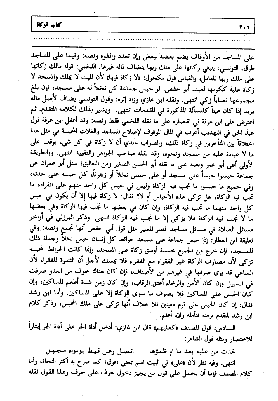 على تجزئ من الأوقاف يضم بعضه لبعض وإن تعدد واقفوه ونصه وفيما على تجزئ طرق التونسي ينبغي زكاتها على ملك ربها ينضاف لماله غيرها اللخمي قوله: مالك زكاتها على ملك ربها للعامل والقياس قول مكحول لا زكاة فيها لأن الميت لا يملك والمسجد لا زكاة عليه ككونها لعبد أبو حفص لو حبس جماعة كل نخلا له على مسجد فإن بلغ مجموعها نصاباً زكي انتهى. ونقله ابن غازي وزاد إثره وقول التونسي يضاف لأصل ماله يريد إذا كان عينا كالمسألة المذكورة في المقدمات انتهى. ويشير بذلك لكلامه المتقدم ثم اعترض على ابن عرفة في اقتصاره على ما نقله اللخمي فقط ونصه وقد أغفل ابن عرفة قول عبد الحق في التهذيب أعرف في المال الموقوف لإصلاح تجزئ والغلات المحبسة في مثل هذا اختلافا بين المتأخرين في زكاة ذلك والصواب عندي أن لا زكاة في كل شيء يوقف على ما لا عبادة عليه من مسجد ونحوه وقد نقله صاحب الجواهر والتقييد انتهى. وبالطريقة الأولى أفتى أبو عمر ونصه على ما نقله أبو الحسن الصغير ومن التعاليق سئل أبو عمران عن جماعة حبسوا حبسا على مسجد أو على حصن نخلا أو زيتونا كل حبسه على حدته وفي جميع ما حبسوا ما تجب فيه الزكاة وليس في حبس كل واحد منهم على انفراده ما تجب فيه الزكاة هل تزكى هذه الأحباس أم لا فقال لا زكاة فيها إلا أن يكون في حبس كل واحد منهما ما تجب فيه الزكاة وإن كان في بعضها ما تجب فيها الزكاة وفي بعضها ما لا تجب فيه الزكاة فلا يزكى إلا ما تجب فيه الزكاة انتهى. وذكر البرزلي في أواخر مسائل الصلاة في مسائل مساجد قصر المسير مثل قول أبي حفص أنها تجمع ونصه وفي تعليقة ابن العطار إذا حبس جماعة على مسجد حوائط كل إنسان حبس نخلا وجملة ذلك للمسجد فإن خرج من الجميع خمسة أوسق زكاة على المسجد وإنما كانت الحوائط المحبسة تزكى لأن مصارف الزكاة غير الفقراء مع الفقراء فلا يمسك لأجل أن الثمرة للفقراء لأن الساعي قد يرى صرفها في غيرهم من الأصناف فإن كان هناك خوف من العدو صرفت في السبيل وإن كان الأمن والرخاء أعتق الرقاب وإن كان زمن شدة أطعم المساكين وإن كان الحبس على المساكين فلا يصرف ما سوى الزكاة إلا على المساكين وأما ابن رشد فقال إن كان الحبس على قوم معينين فلا خلاف أنها تزكى على ملك المحبس وذكر كلام ابن رشد لمتقدم برمته فتأمله والله أعلم.