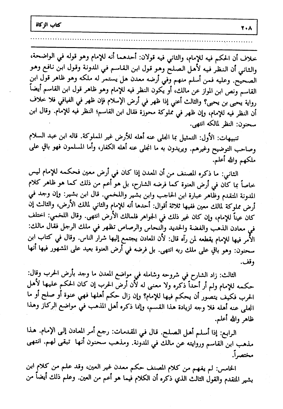 خلاف أن الحكم فيه للإمام والثاني فيه قولان أحدهما أنه للإمام وهو قوله في الواضحة والثاني أن النظر فيه لأهل الصلح وهو قول ابن القاسم في المدونة وقول ابن نافع وهو الصحيح وعليه فمن أسلم منهم وفي أرضه معدن هل يستمر له ملكه وهو ظاهر قول ابن القاسم ونص ابن المواز عن مالك أو يكون النظر فيه للإمام وهو ظاهر قول ابن القاسم أيضا رواية يحيى بن يحيى والثالث أعني إذا ظهر في أرض الإسلام فإن ظهر في الفيافي فلا خلاف أن النظر فيه للإمام وإن ظهر في مملوكة محوزة فقال ابن القاسم النظر فيه للإمام وقال ابن سحنون النظر لمالكه انتهى.