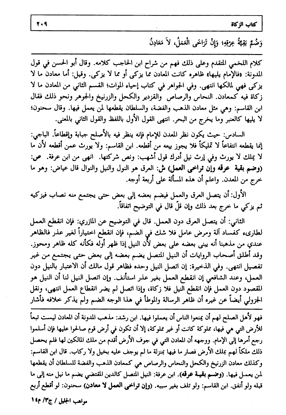السادس: حيث يكون نظر المعدن للإمام فإنه ينظر فيه بالأصلح جبابة وإقطاعا الباجي إنما يقطعه انتفاعا لا تمليكا فلا يجوز بيعه من أقطعه ابن القاسم ولا يورث عمن أقطعه لأن ما لا يملك لا يورث وفي إرث نيل أدرك قول أشهب ونص شركتها انهى من ابن عرفة. ص: "بقية عرقه وإن تراخى العمل". ش: العرق هو النول والنيل والنوال قال عياض وهو ما خرج من المعدن واعلم أن هذه المسألة على أربعة أوجه.