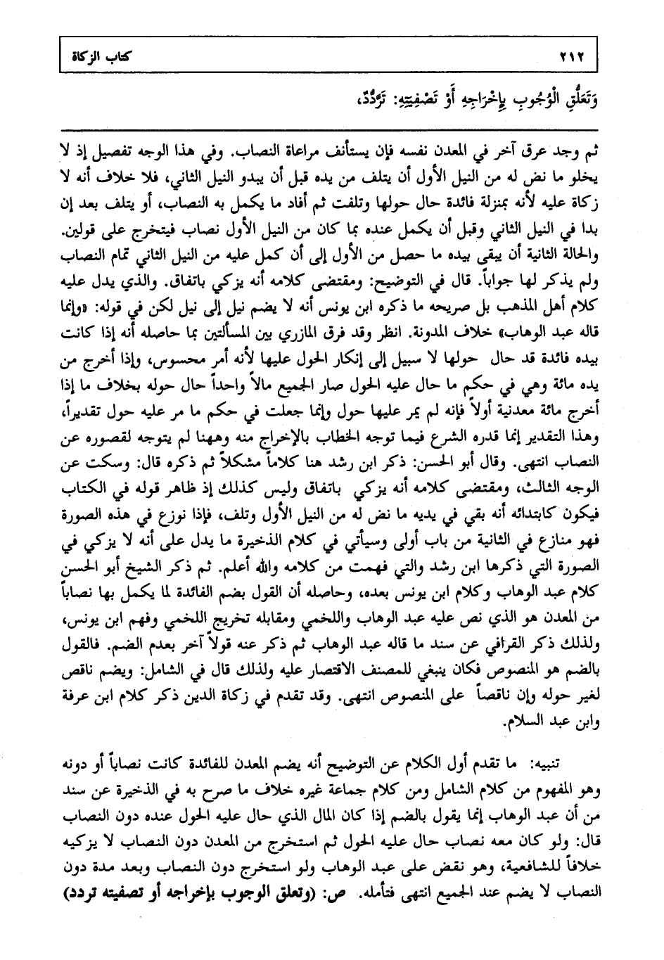 ثم وجد عرق آخر في المعدن نفسه فإنه يستأنف مراعاة النصاب وفي هذا الوجه تفصيل إذ لا يخلو ما نض له من النيل الأول أن يتلف من يده قبل أن يبدو النيل الثاني فلا خلاف أنه لا زكاة عليه لأنه بمنزلة فائدة حال حولها وتلفت ثم أفاد ما يكمل به النصاب أو يتلف بعد أن بدا في النيل الثاني وقبل أن يكمل عنده بما كان من النيل الأول نصاب فيتخرج على قولين والحالة الثانية أن يبقى بيده ما حصل من الأول إلى أن كمل عليه من النيل الثاني تمام النصاب ولم يذكر لها جوابا قال في التوضيح: ومقتضى كلامه أنه يزكي باتفاق والذي يدل عليه كلام أهل المذهب بل صريحه ما ذكره ابن يونس أنه لا يضم نيل إلى نيل لكن في قوله وإنما قاله عبد الوهاب خلاف المدونة انظر وقد فرق المازري بين المسألتين بما حاصله أنه إذا كانت بيده فائدة قد حال حولها لا سبيل إلى إنكار الحول عليها لأنه أمر محسوس وإذا أخرج من يده مائة وهي في حكم ما حال عليه الحول صار الجميع مالا واحدا حال حوله بخلاف ما إذا أخرج مائة معدنية أولا فإنه لم يمر عليها حول وإنما جعلت في حكم ما مر عليه حول تقديرا وهذا التقدير إنما قدره الشرع فيما توجه الخطاب بالإخراج منه وههنا لم يتوجه لقصوره عن النصاب انتهى. وقال أبو الحسن ذكر ابن رشد هنا كلاما مشكلا ثم ذكره قال وسكت عن الوجه الثالث ومقتضى كلامه أنه يزكي باتفاق وليس كذلك إذ ظاهر قوله في الكتاب فيكون كابتدائه أنه بقي في يديه ما نض له من النيل الأول وتلف فإذا نوزع في هذه الصورة فهو منازع في الثانية من باب أولى وسيأتي في كلام الذخيرة ما يدل على أنه لا يزكي في الصورة التي ذكرها ابن رشد والتي فهمت من كلامه والله أعلم. ثم ذكر الشيخ أبو الحسن كلام عبد الوهاب وكلام ابن يونس بعده وحاصله أن القول بضم الفائدة لما يكمل به نصاباً من المعدن هو الذي نص عليه عبد الوهاب واللخمي ومقابله تخريج اللخمي وفهم ابن يونس ولذلك ذكر القرافي عن سند ما قاله عبد الوهاب ثم ذكر عنه قولا آخر بعدم الضم فالقول بالضم هو المنصوص فكان ينبغي للمصنف الاقتصار عليه ولذلك قال في الشامل: ويضم ناقص لغير حوله وإن ناقصا على المنصوص انتهى. وقد تقدم في زكاة الدين ذكر كلام ابن عرفة وابن عبد السلام. تنبيه: ما تقدم أول الكلام عن التوضيح أنه يضم المعدن للفائدة كانت نصاباً أو دونه وهو المفهوم من كلام الشامل ومن كلام جماعة غيره خلاف ما صرح به في الذخيرة عن سند من أن عبد الوهاب إنما يقول بالضم إذا كان المال الذي حال عليه الحول عنده دون النصاب قال ولو كان معه نصاب حال عليه الحول ثم استخرج من المعدن دون النصاب لا يزكيه خلافا للشافعية وهو نقض على عبد الوهاب ولو استخرج دون النصاب وبعد مدة دون النصاب لا يضم عند الجميع انتهى. فتأمله . ص: "وتعلق الوجوب بإخراجه أو تصفيته تردد"