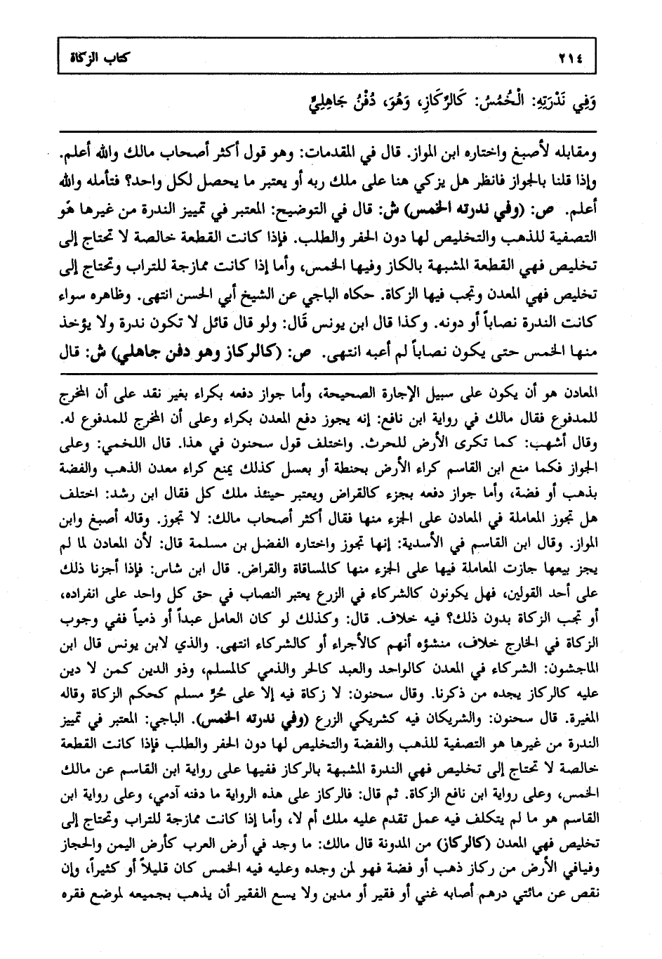 ومقابله لأصبغ واختاره ابن المواز قال في المقدمات وهو قول أكثر أصحاب مالك والله أعلم. وإذا قلنا بالجواز فانظر هل يزكي هنا على ملك ربه أو يعتبر ما يحصل لكل واحد فتأمله والله أعلم. ص: "وفي ندرته الخمس". ش: قال في التوضيح: المعتبر في تمييز الندرة من غيرها هو التصفية للذهب والتخليص لها دون الحفر والطلب فإذا كانت القطعة خالصة لا تحتاج إلى تخليص فهي القطعة المشبهة بالركاز وفيها الخمس وأما إذا كانت ممازجة للتراب وتحتاج إلى تخليص فهي المعدن وتجب فيها الزكاة حكاه الباجي عن الشيخ أبي الحسن انتهى. وظاهره سواء كانت الندرة نصاباً أو دونه وكذا قال ابن يونس وقال: ولو قال قائل: لا تكون ندرة ولا يؤخذ منها الخمس حتى تكون نصاباً لم أعبه انتهى. ص: "كالركاز وهو دفن جاهلي". ش: قال