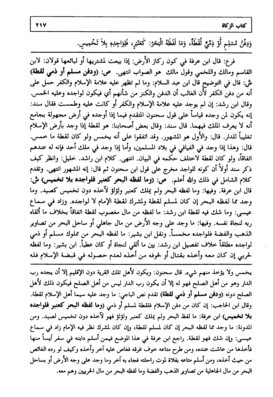 فرع قال ابن عرفة في كون ركاز الأرض إذا بيعت لمشتريها أو لبائعها: قولان لابن القاسم ومالك واللخمي وقول مالك هو الصواب انتهى. ص: "ودفن مسلم أو ذمي لقطة". ش: قال في التوضيح: قال ابن عبد السلام: وما لم تظهر عليه علامة الإسلام والكفر حمل على أنه من دفن الكفر لأن الغالب أن الدفن والكنز من شأنهم أي فيكون لواجده وعليه الخمس وقال ابن رشد إن لم يوجد عليه علامة الإسلام والكفر أو كانت عليه وطمست فقال سند إنه يكون لمن وجده قياسا على قول سحنون المتقدم فيما إذا أوجده في أرض مجهولة بجامع أنه لا يعرف الملك فيهما قال سند: وقال بعض أصحابنا: هو لقطة إذا وجد بأرض الإسلام تغليبا للدار قال والأول هو المشهور وقد اتفقوا على أنه يخمس ولو كان لقطة ما خمس قال وهذا إذا وجد في الفيافي في بلاد المسلمين وأما إذا وجد في ملك أحد فإنه له عندهم اتفاقا ولو كان لقطة لاختلف حكمه في البيان انتهى. كلام ابن راشد خليل وانظر كيف ذكر سند أولا أن كونه للواجد مخرج على قول ابن سحنون ثم قال إنه المشهور انتهى. وتقدم كلام الشامل في ذلك والله أعلم. ص: "وما لفظه البحر كعنبر فلواجده بلا تخميس". ش: قال ابن عرفة: وفيها وما لفظه البحر ولم يملك كعنبر ولؤلؤ لآخذه دون تخميس كصيد وما وجد مما لفظه البحر إن كان لمسلم لقطة ولمشرك لقطة الإمام لا لواجده وزاد في سماع عيسى وما شك فيه لقطة ابن رشد ما لفظه من مال مغصوب لقطة اتفاقا بخلاف ما ألقاه ربه لنجاة نفسه وفيها ما وجد على وجه الأرض من مال جاهلي أو ساحل البحر من تصاوير الذهب والفضة فلواجده مخمسا ونقل ابن بشير ما لفظه البحر من مملوك مسلم أو ذمي لواجده مطلقا خلاف تفصيل ابن رشد بين ما ألقي لنجاة أو كان عطبا ابن بشير وما لفظه لحربي إن كان معه وأخذه بقتال أو لخوفه من أخذه لعدم حصوله في قبضة الإسلام فله