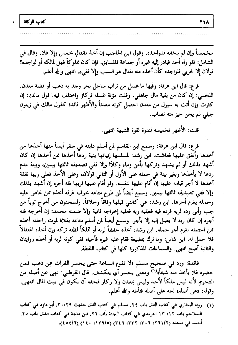 فرع: قال ابن عرفة: وفيها ما غسل من تراب ساحل بحر وجد به ذهب أو فضة معدن اللخمي إن كان من بقية مال جاهلي غسله فركاز واختلف فيه قول مالك إن كثرت وإن أتت به سيول من معدن احتمل كونه معدنا والأظهر فائدة كقول مالك في زيتون جبلي لم يجن حيز منه نصاب.